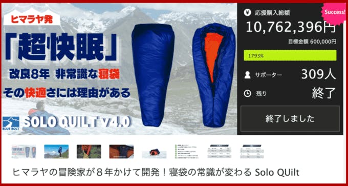 2022/10/27 19:50サポーターの皆様、お世話になります!冬の訪れを感じる今日この頃ですが、いかがお過ごしでしょうか。さて、-20℃タイプのソロキルト が、メーカーよりサポーター様宅へ発送されました。メーカーから直接のお届けになりますので、1〜2週間お待ちいただけますと幸いです。引き続きよろしくお願いいたします! ナイアトレード スタッフ一同 もっと見るプロジェクト終了のご報告とお礼