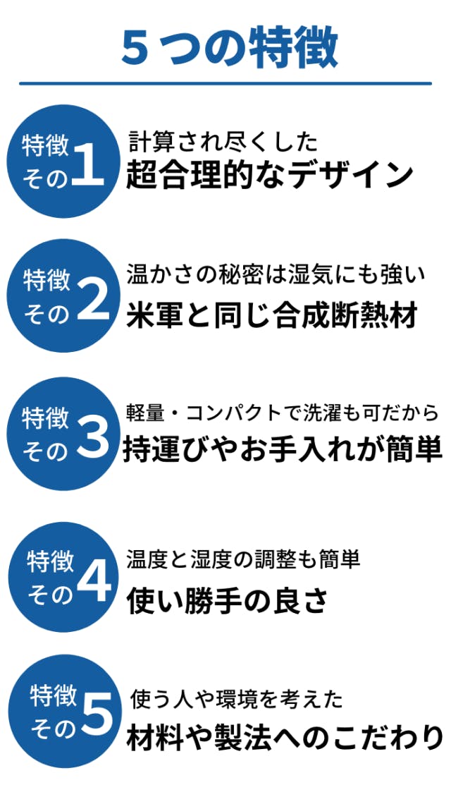 温かさの秘密は米軍でも採用されている合成断熱材にあります。