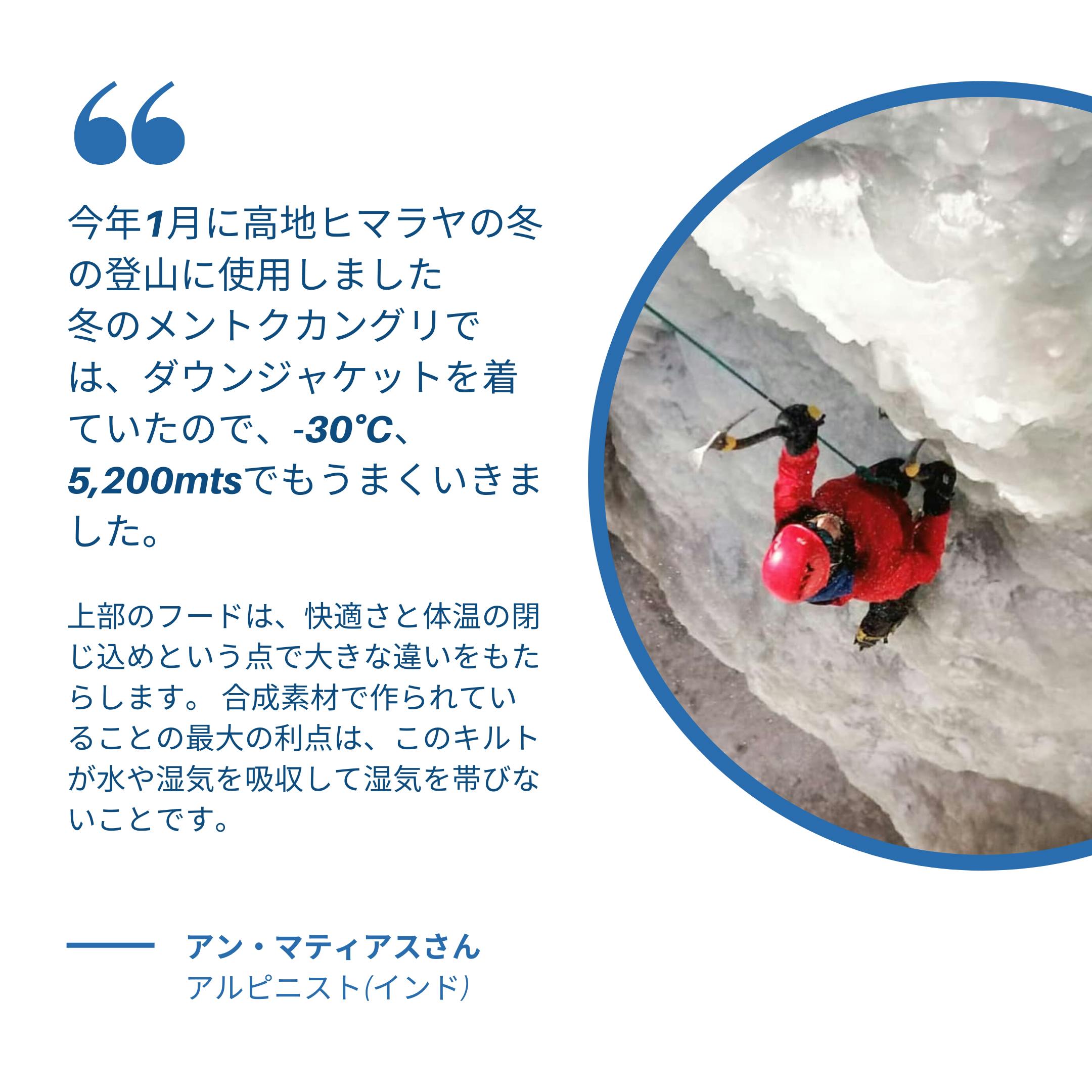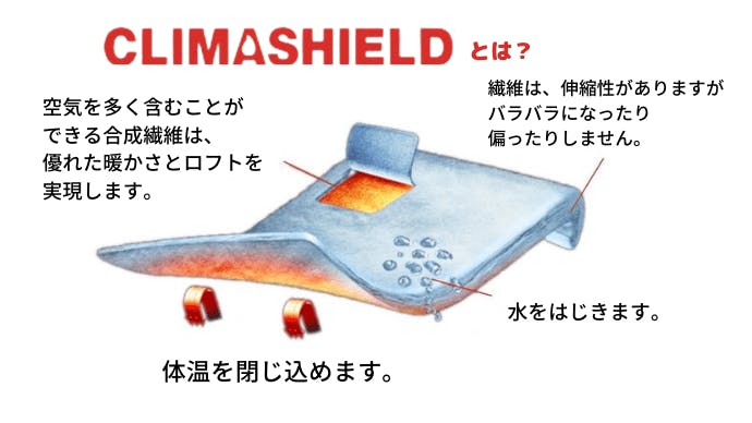 Climashieldと防湿生地の10Dナイロンで湿気を寄せ付けないから温かさが持続。万が一濡れても、驚くほど乾きが早いのです。