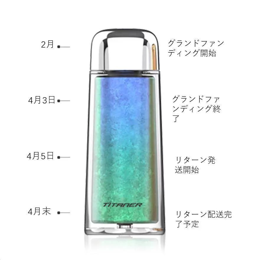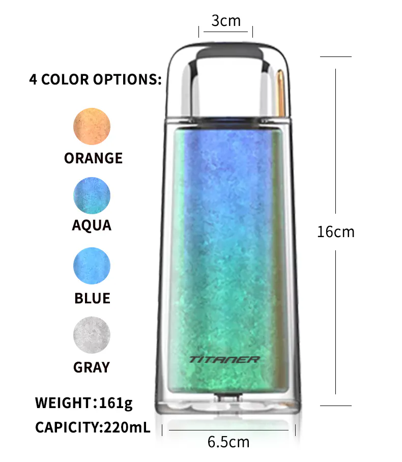 私たちは、新しい商品のボトルを開発するに当たり、材料としてこの優れたチタンに注目し ました。単なるチタン製ボトルを作るのではなく、デザイン性や機能性を持たせることがで きないものか、、、。たどり着いた答えは、携帯性を重視してチタン製のボトルをコンパクト に、見た時にハッとする宝石の様なデザイン、そして、ボトル内の温度が知りたいときに表 示できるギミックもある。そんな、ファッショナブルで機能的なチタン製ボトル。これが、 我々がたどり着いた答えでした。 我々は、数年前に同じチタン製の魔法瓶を作り、今も多くのお客様に愛用されています。し かし、チタンボトルの素晴らしさを伝える事には成功しましたが、携帯性やデザイン面は、 満足するレベルに達しは達していませんでした。 今回ご紹介する「TITANER」は、我々が導いた答えをすべて満たしてくれます。 それはコンパクトで林檎よりも軽く、「TITANER」はあらゆるシーンで活用します。220 mlの容量は、多からず少なからず、携行するには十分です。 水、ミルク、コーヒー、紅茶、コーラ、スムージーパワーシェイクどんな飲み物も注いでも 入れた時の味のまま。飲み終わった後の洗浄も簡単です。 「TITANER」はとても強くて、耐久性があります。