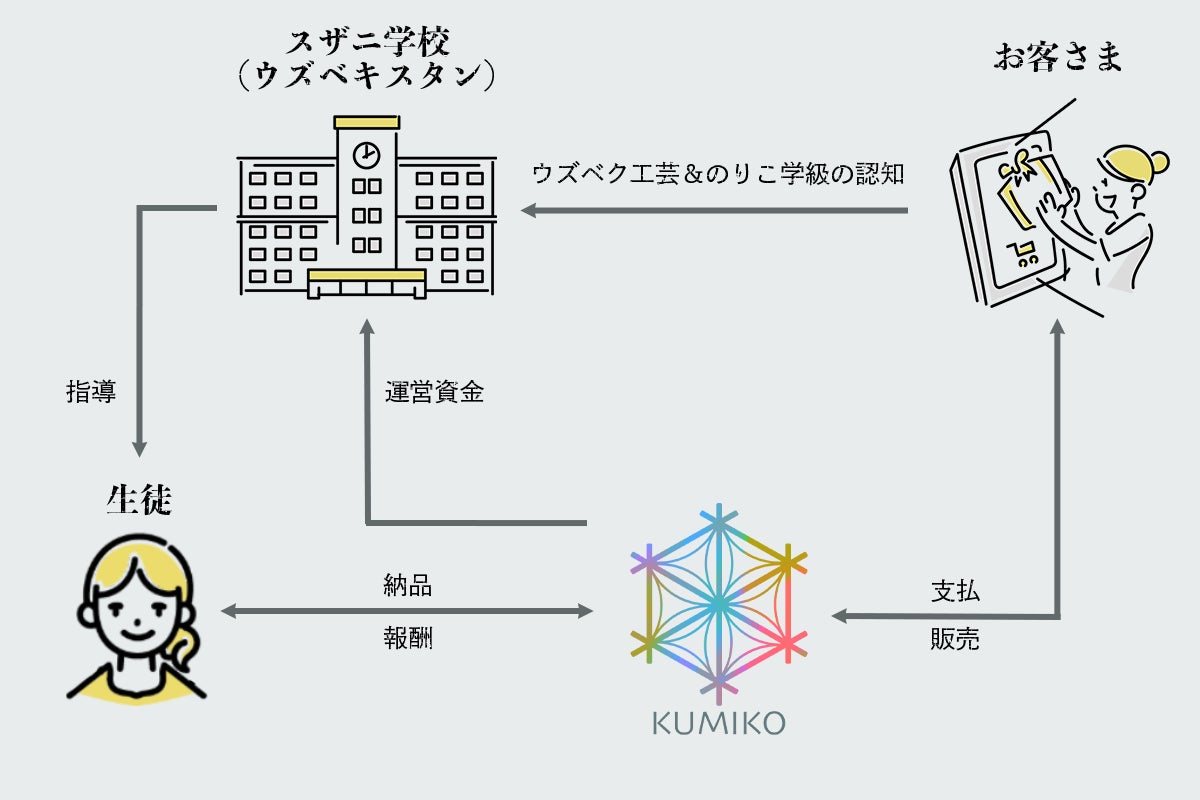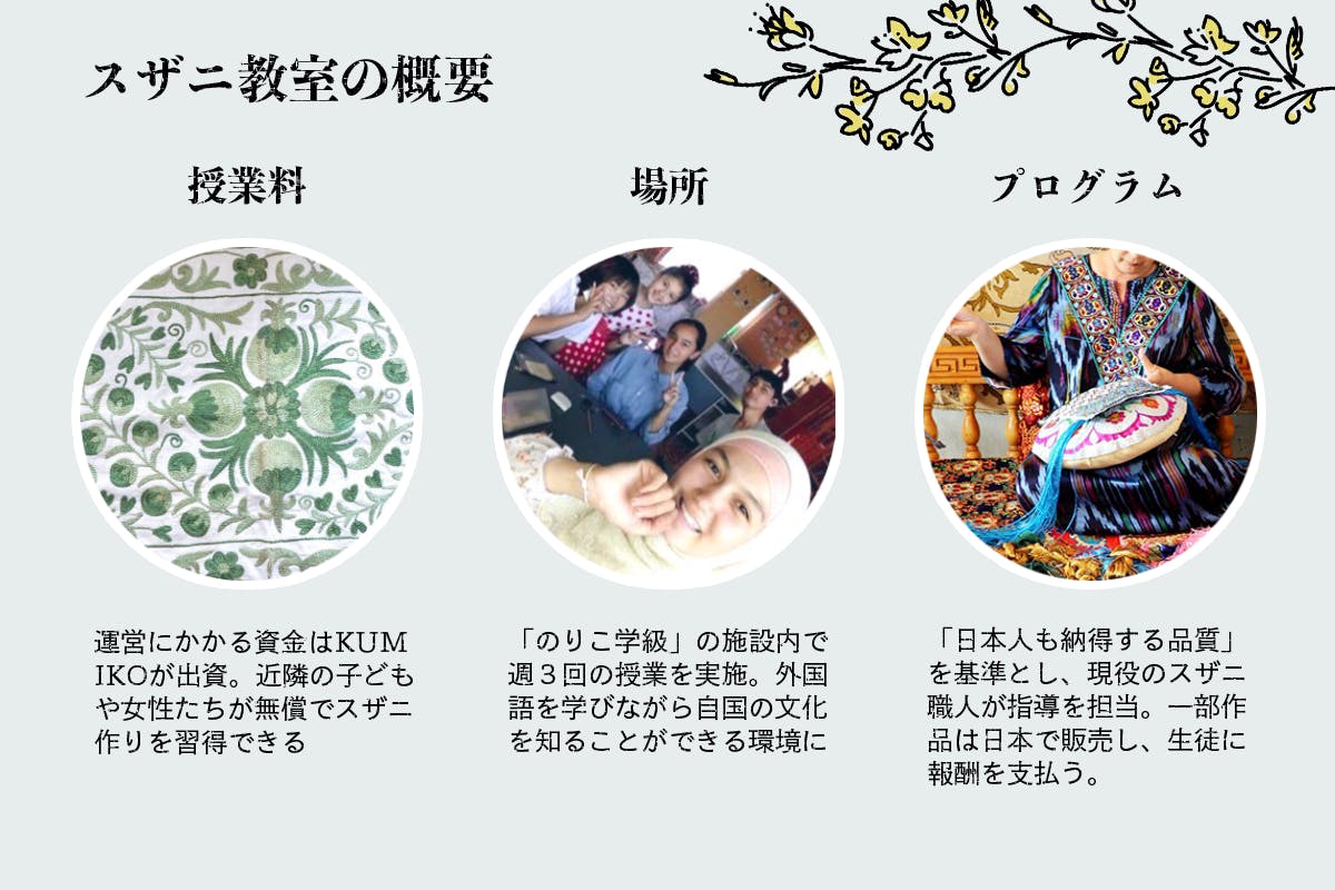 この度、KUMIKOは中央アジア・ウズベキスタンで無償の日本語教育を提供する「のりこ学級」との共同プロジェクトとして、2022年3月下旬よりウズベク伝統工芸スザニ(刺繍布)の制作を学ぶことができる「スザニ教室」をOPENすることとなりました。
