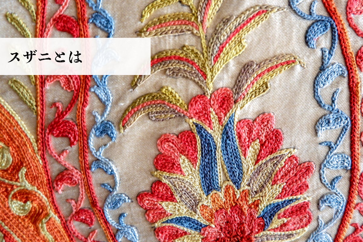 スザニとは、ウズベキスタンをはじめとした中央アジアの国々で作られ、お家の壁を華やかに飾りあげる刺繍布のこと。18〜19世紀の中央アジアでは、スザニの壁掛けは嫁入りの際の必需品。少女たちは幼い頃から刺繍を習い始め、新郎に贈るスザニを制作しました。
