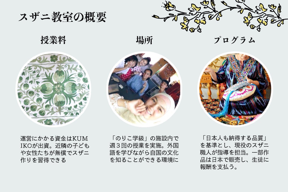日本とウズベキスタンの架け橋として22年もの歴史をもつのりこ学級。そして「世界の伝統的なデザインを日常に組み込む」をコンセプトに、中央アジアにゆかりのある商品を販売してきたKUMIKO。そこに伝統工芸産業を支えるフェルガナ州という土地柄が重なり、のりこ学級の中にスザニを習える場所を作り、そこで作られた作品をKUMIKOが日本で販売しよう!ということで、スザニ教室を始めることになりました。