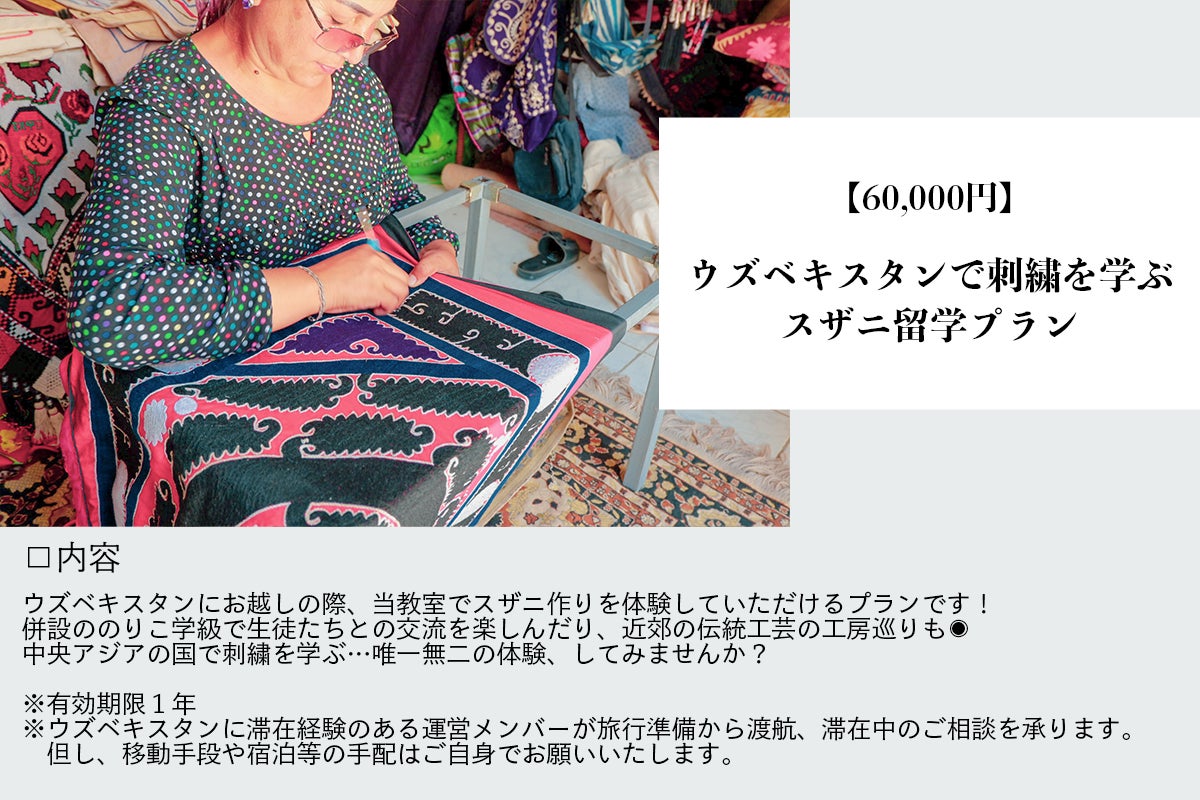 注)2022/02/20現在、ウズベキスタンは入国48時間前のPCR検査の陰性証明書をもつ日本国民の入国を隔離期間なしで認めています。ただし、ウズベキスタンへの入国が不可能となる際は有効期限を延長させていただくことがございます。また、このリターンはコロナ禍での海外渡航を推奨するわけではありません。日本政府とウズベキスタン政府の定める出入国規定をよくご確認いただき、自己責任での渡航となることをご了承いただいた上で購入をお願いいたします。リシタン(スザニ教室所在地)では併設の日本語学校「のりこ学級」の施設内に宿泊することができます。(のりこ学級はウズベキスタンでの宿泊事業者登録をしていますので、観光ビザでの同国滞在時に宿泊施設で必要となる滞在登録「レギストレーツィア」も発行できます)