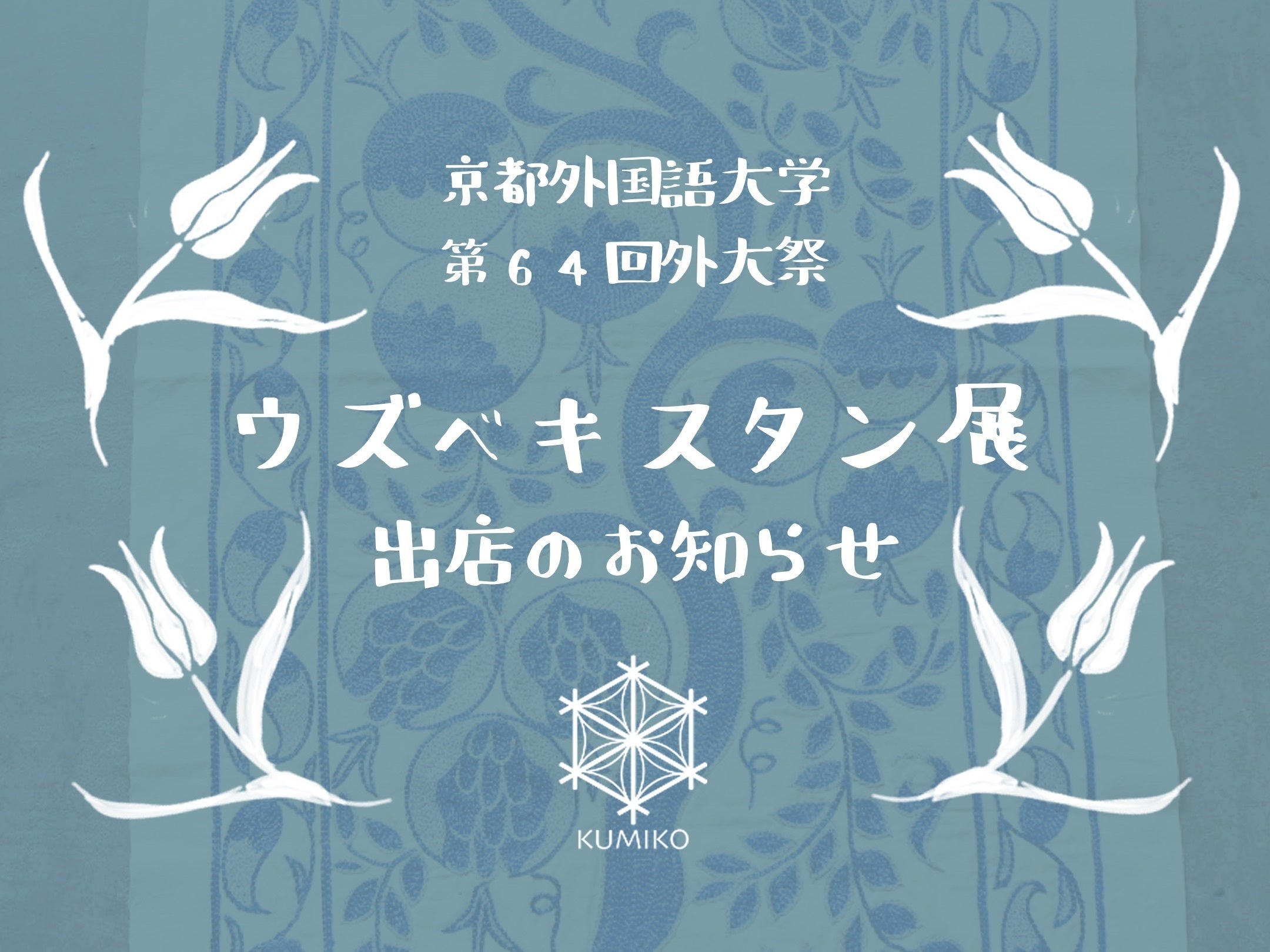 2022/10/21 16:57ウズベキスタン展@京都外国語大学第64回外大祭KUMIKO出店のおしらせ11月6日、7日に開催される京都外国語大学の外大祭にて、同校学生によるウズベキスタンに関する展示がおこなわれます。会場ではKUMIKOが中央アジアの伝統刺繍「スザニ」の展示に参加するほか、ウズベク雑貨のプチ販売も!グローバルな活気にあふれる外大祭におでかけして、シルクロードの交差路・ウズベキスタンの魅力に出会ってみませんか?日時11月6日(日)10:00*-17:0011月7日(月)10:00-15:30場所京都外国語大学2号館 R242、R243教室〈公式HP「交通アクセス」〉https://www.kufs.ac.jp/access/index.html 〈Google map〉https://goo.gl/maps/BR38uhnCABZbUCC78展示スペースではスザニ教室生徒の作品もお持ちし、活動紹介を行います。少量ですがスザニのクッションカバー、ウズベクの絣織物製品の販売等も行いますので、お近くのかたはぜひご覧いただければと思います。注意事項※6日の開始時間は11:00~に変更する可能性があります。KUMIKOのSNS、HPで随時お知らせしますので、ご確認ください。※スザニの展示スペースでは飲食物の持ち込みをご遠慮ください。※雑貨のご購入は現金のみ承っております。※物販での具体的な販売商品はKUMIKOホームページのショップブログに随時追記していきます。 もっと見る