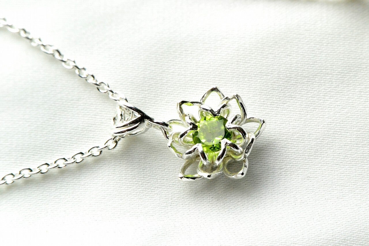直径5.5mmのラウンドファセットカットのペリドットを蓮花フレームに納めた春の陽気をそのまま暮らしの中に導いてゆくペンダント。