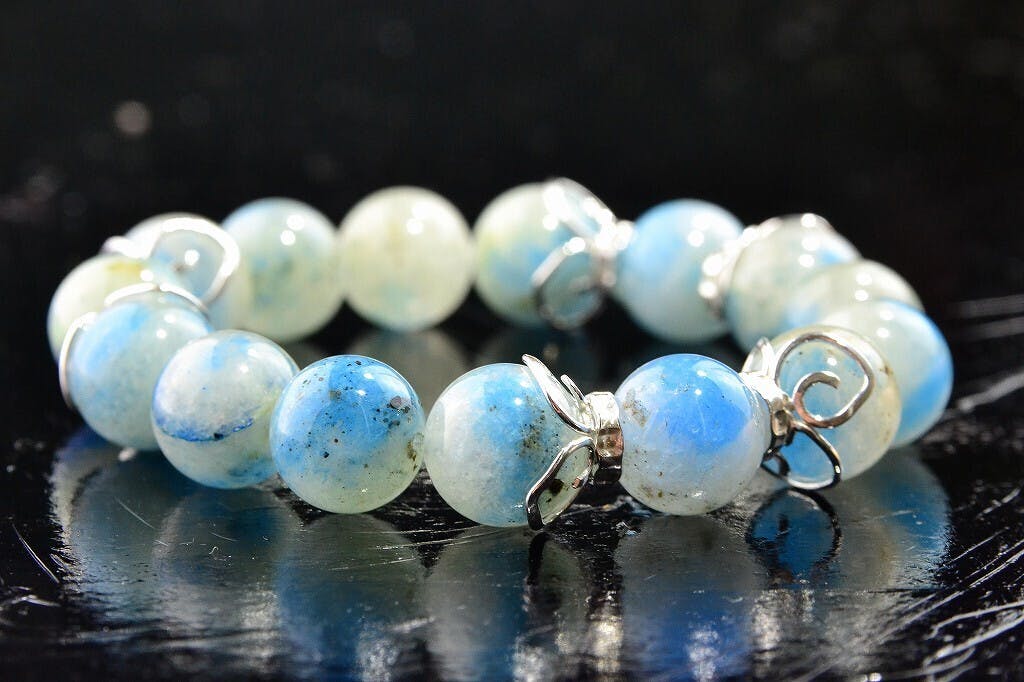 全く新種のこの美しい石は、その半透明の中にアズライトのブルーラインが析出したミステリアスの極みのような存在。