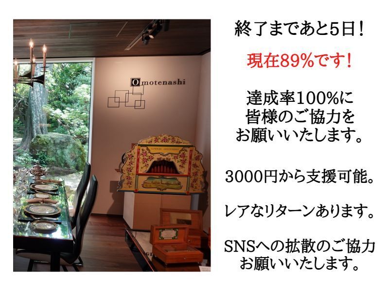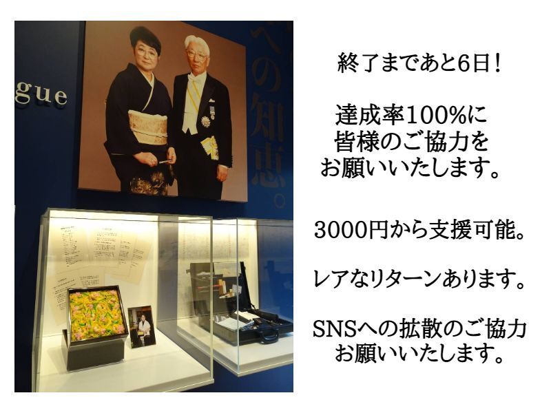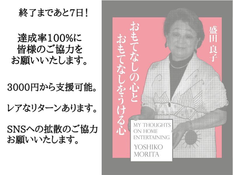 盛田良子の著書「おもてなしの心とおもてなしをうける心」の復刊プロジェクトも終了まであと5日となりました。現在達成率89% となっております。昨日ご支援頂きました方々、一気に100%に近づきました!感謝申し上げます。そして開始当初からご寄付頂きました方々、厚く御礼申し上げます。達成率100%とまであと一押しです。ひとりひとりのご支援が重なって、大きな目標を達成することができます。皆様のご支援をよろしくお願いします。【ご協力をお願いします】① クラウドファンディング①クラウドファンディングへの支援まだご支援を悩まれている方は、3,000円からご支援いただけますので、お願いいたします。また盛田昭夫塾ツアーや絶版本がセットになっているリターンもありますので是非ご支援をお願いいたします。②SNSなどへのプロジェクト拡散。インスタグラムやTwitter、Facebookへの投稿や拡散をお願いします。「盛田良子(盛田昭夫ソニー創業者妻)の本を出版から50年で復刊したい」https://camp-fire.jp/projects/view/561378重ねて、皆様のお力添えを頂きたくお願いいたします。