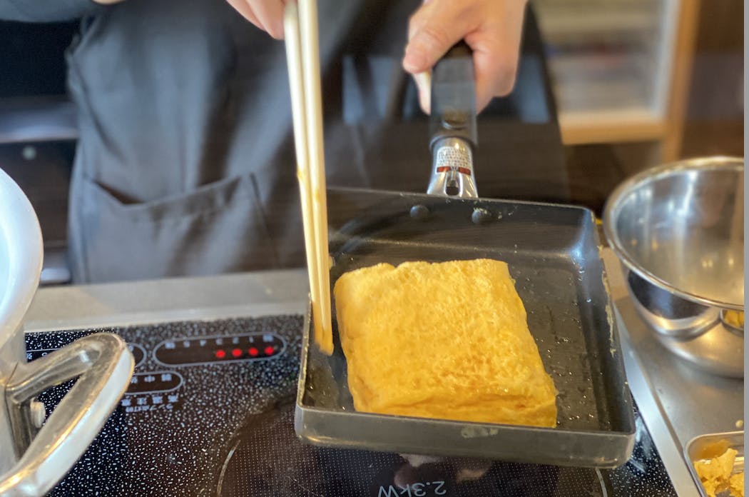 だし巻きたまごをサンドイッチ用に成形しながら焼いていきます。