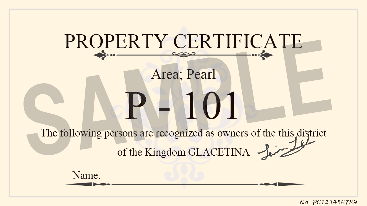 ※物件所有証明書(城下町)は集合住居の1室、土地所有証明書(貴族街)は土地と邸宅が対象です。内装や家具など詳細は「バーチャル空間上のグレスティナ王国(氷解後)」着手後にご相談させてください。