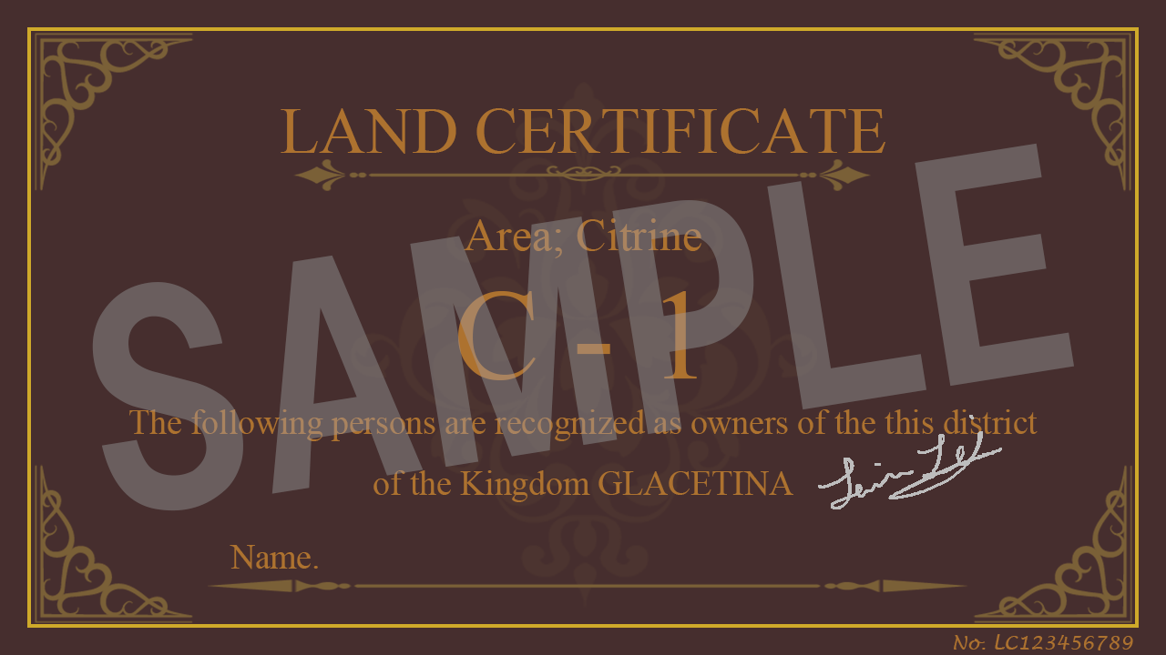 この「バーチャル空間上のグレスティナ王国(氷解後)」の物件所有証明書(城下町)/土地所有証明書(貴族街)です。(注意事項)を必ず一読し、支援をご検討ください。