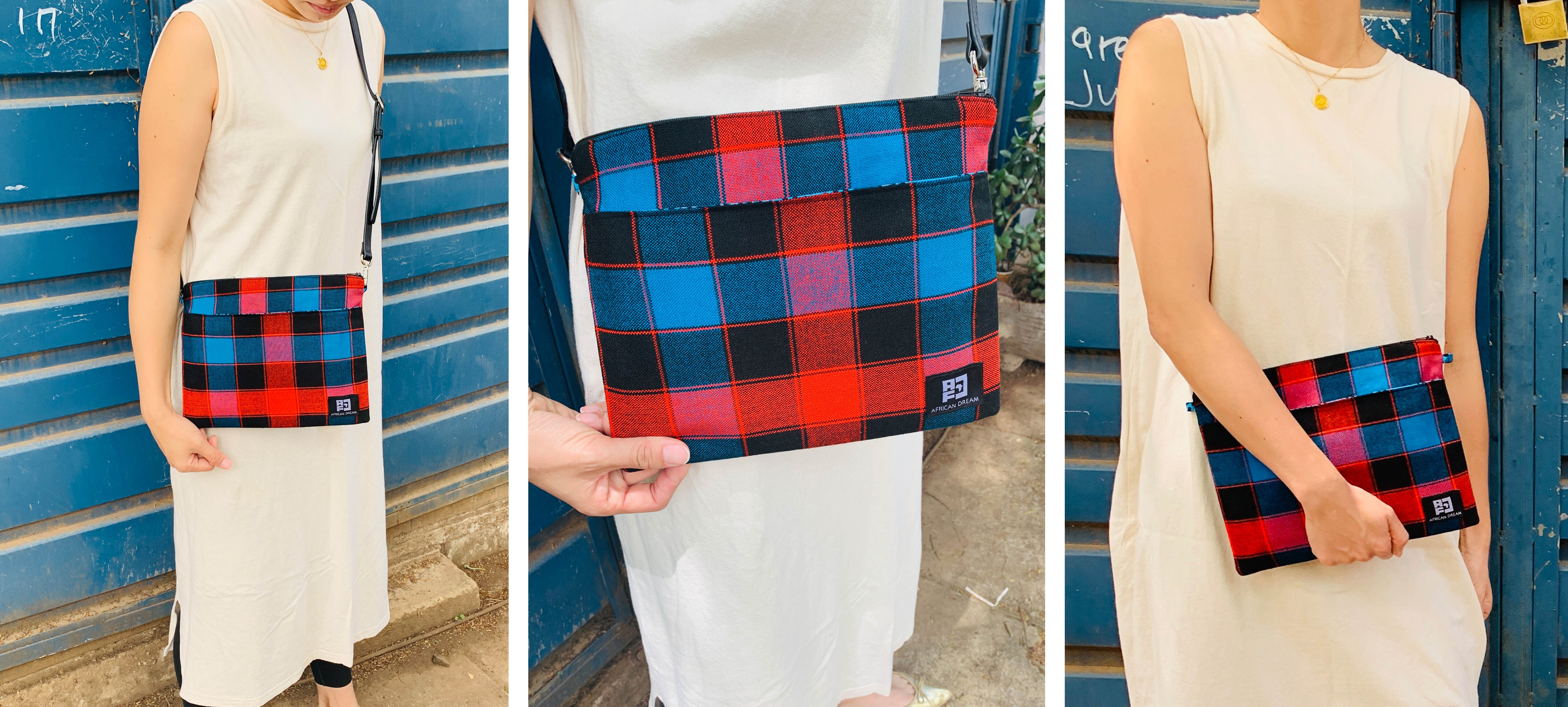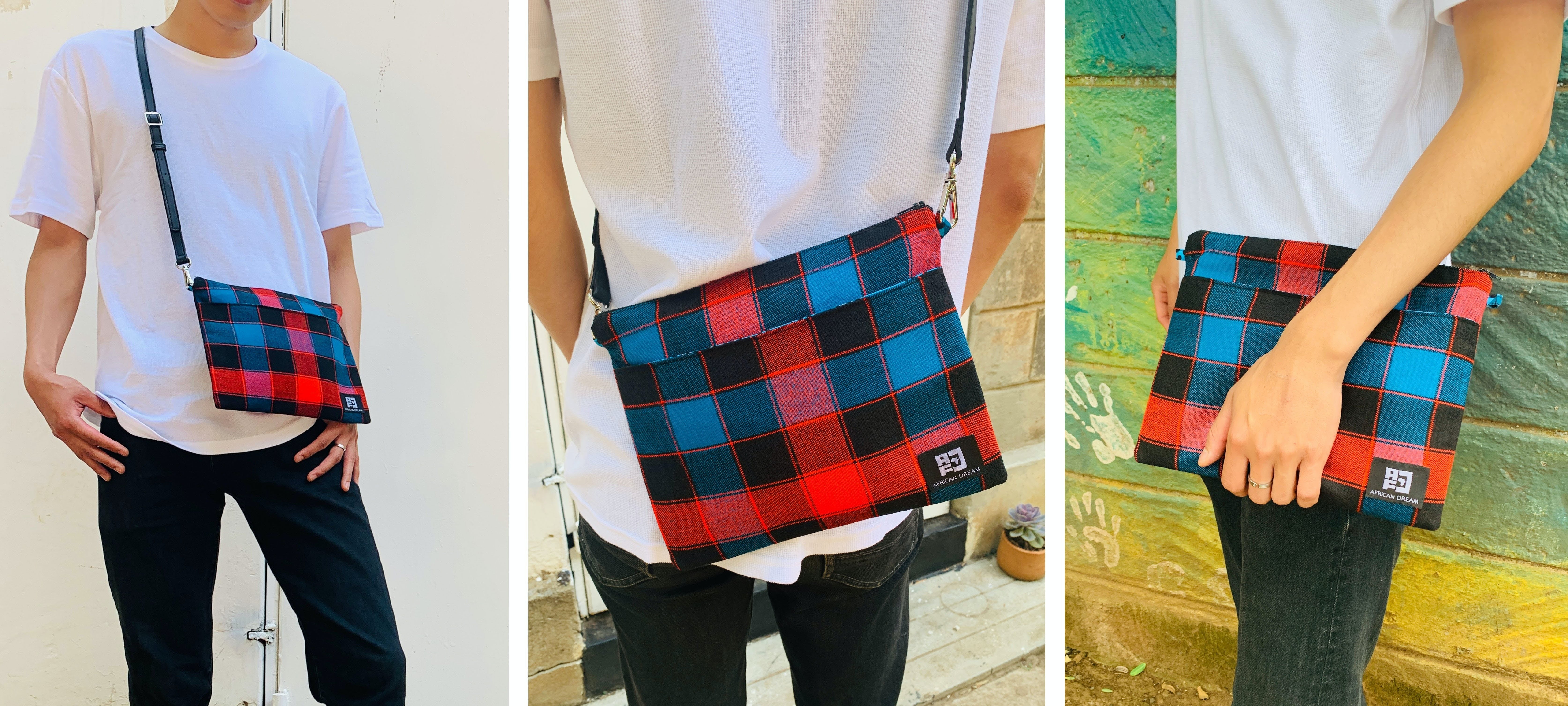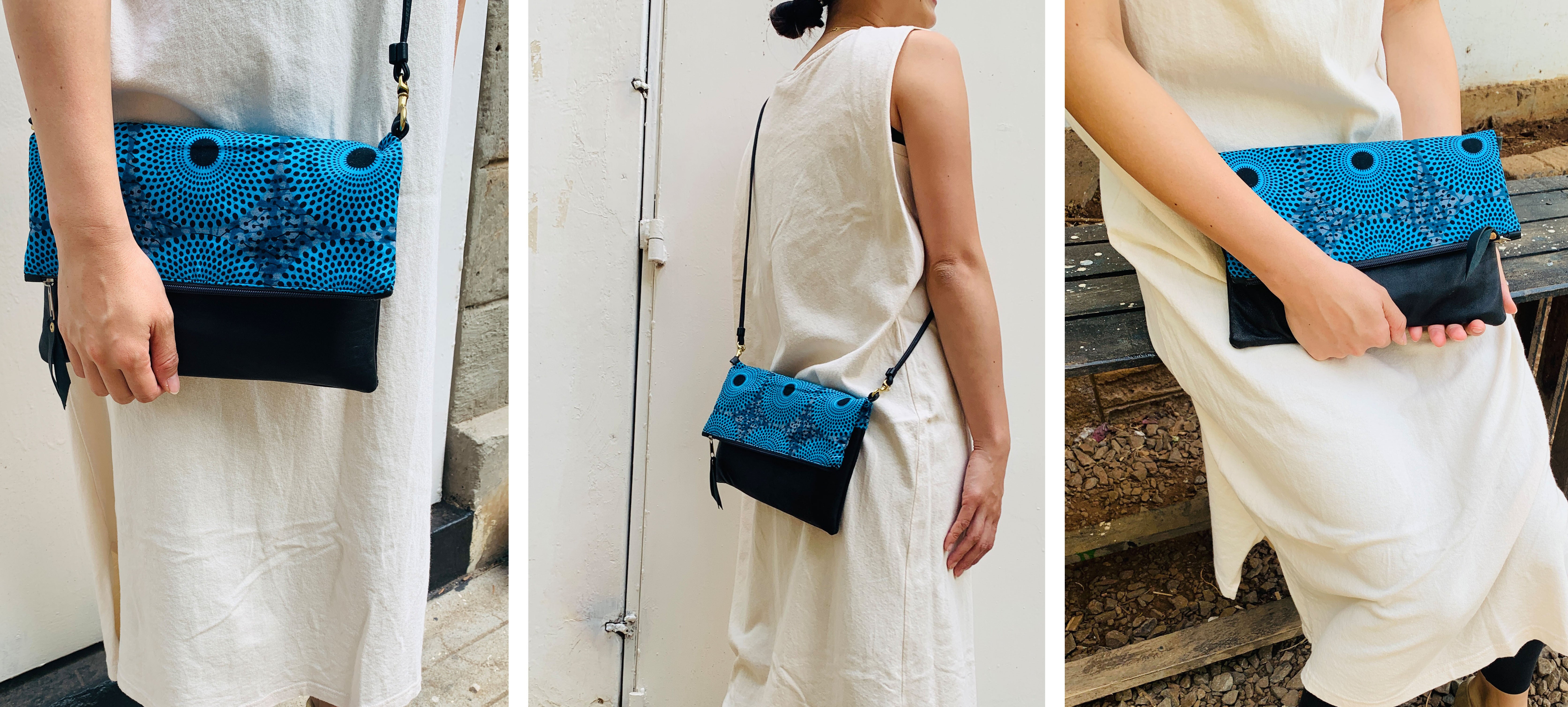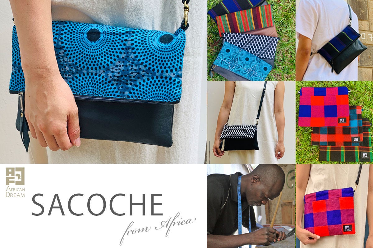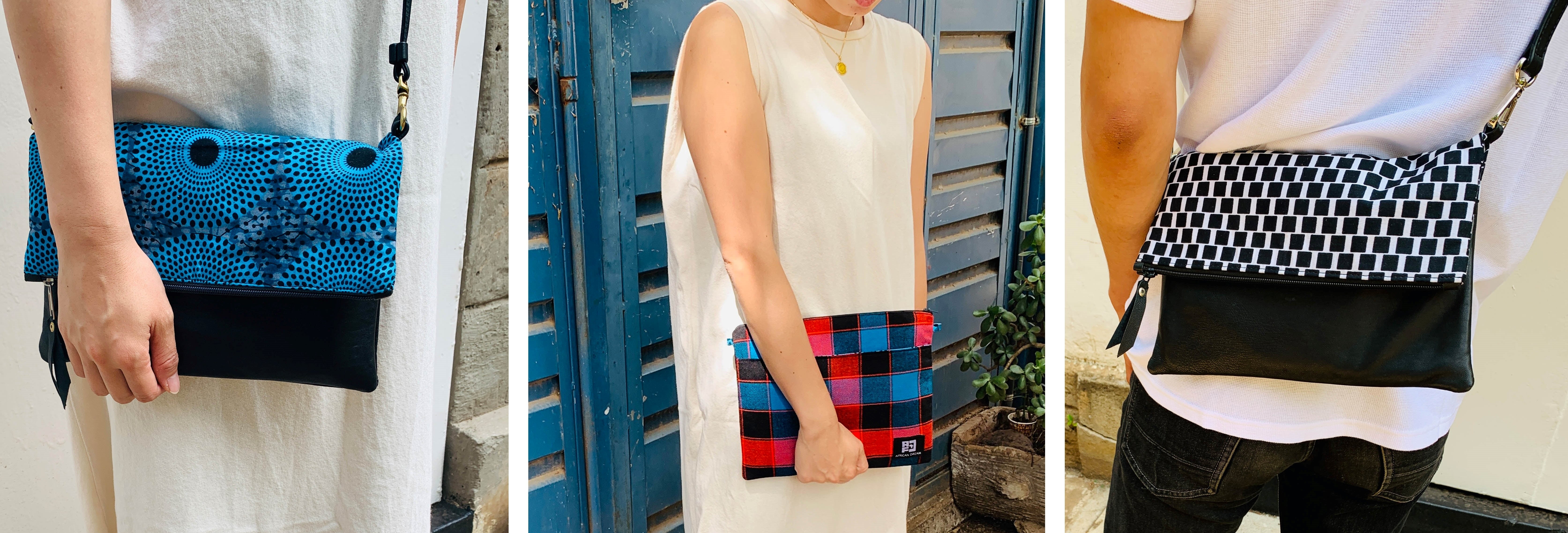 アフリカのカラフルで個性的な布や、古着の再利用レザーを使ったサコッシュでファッションを楽しみながら、商品の購入が現地の雇用創出・環境問題への取組みに繋がる、そんなプロジェクトです。
