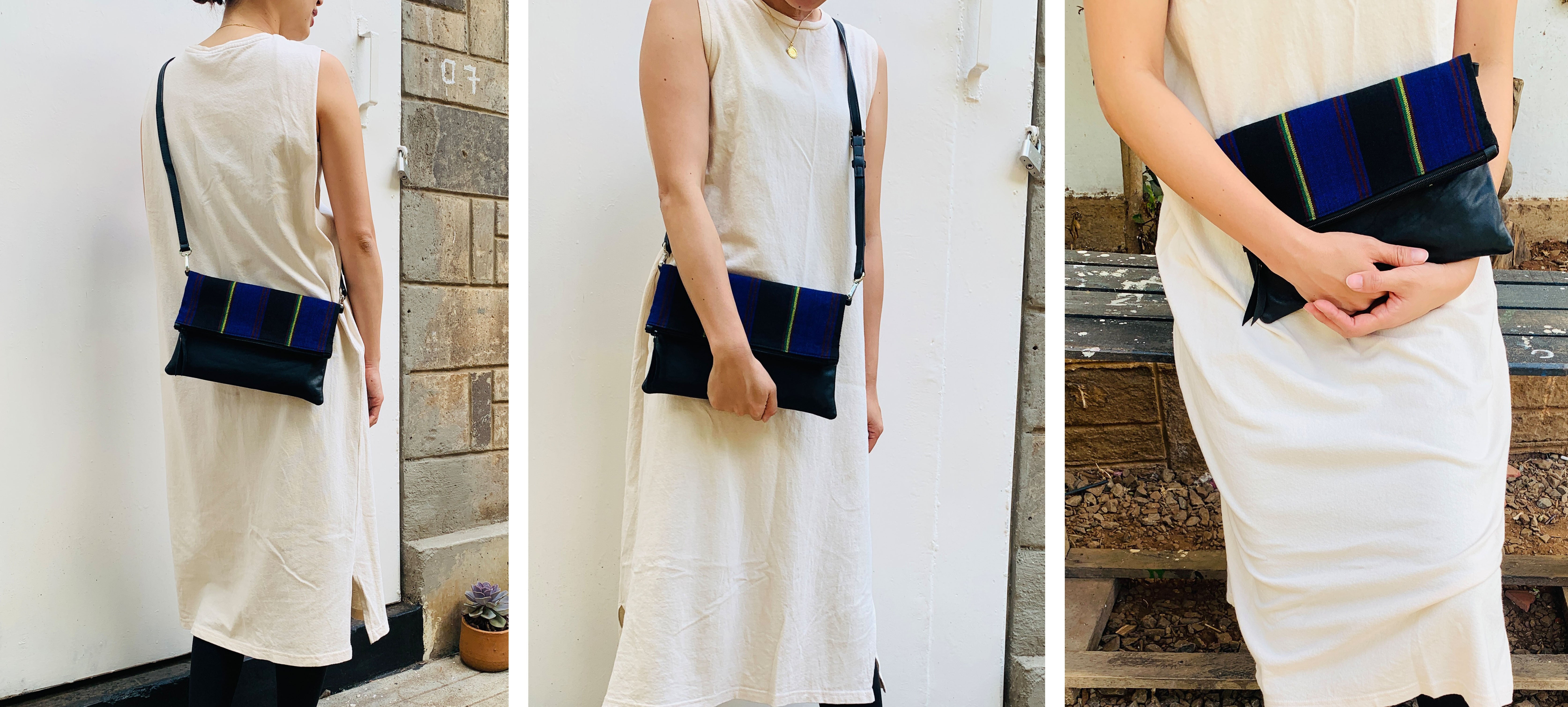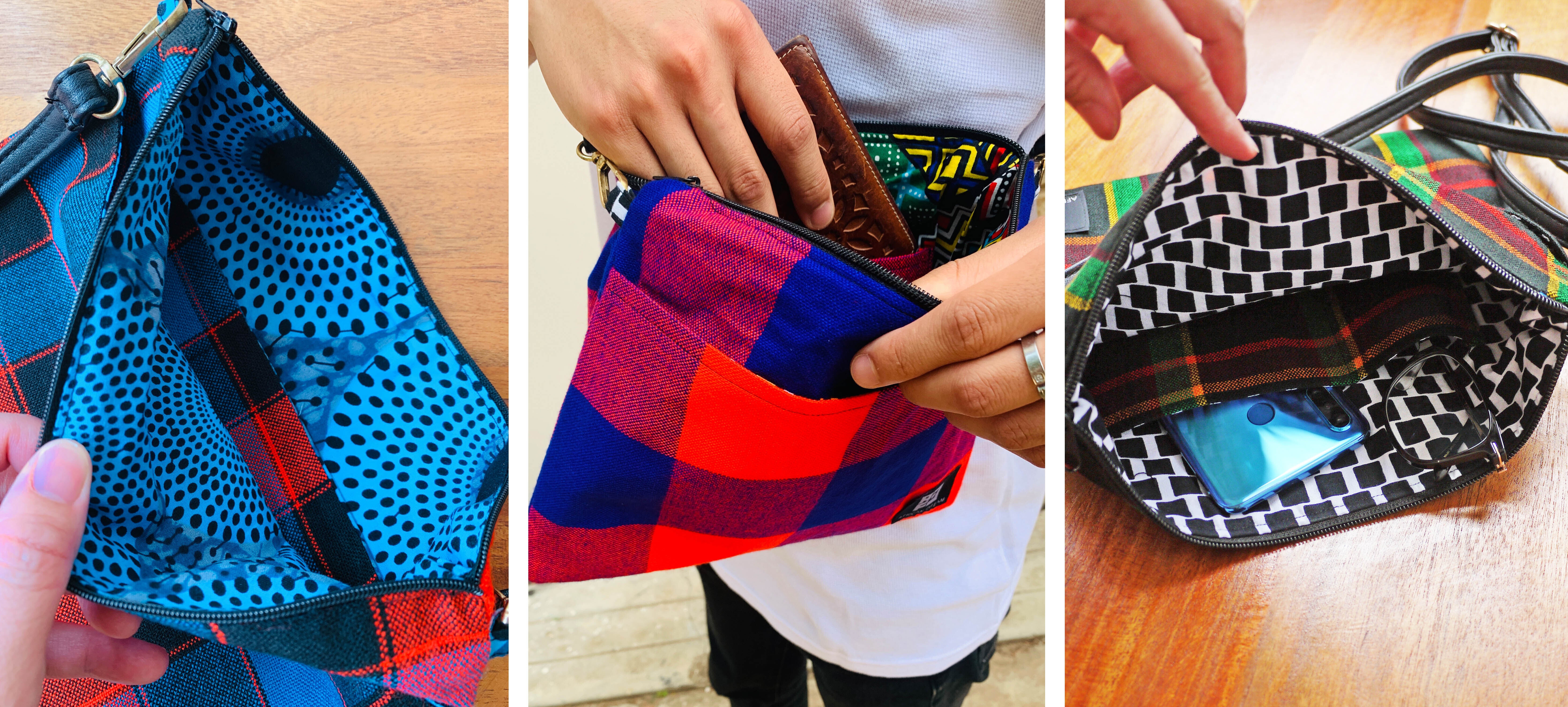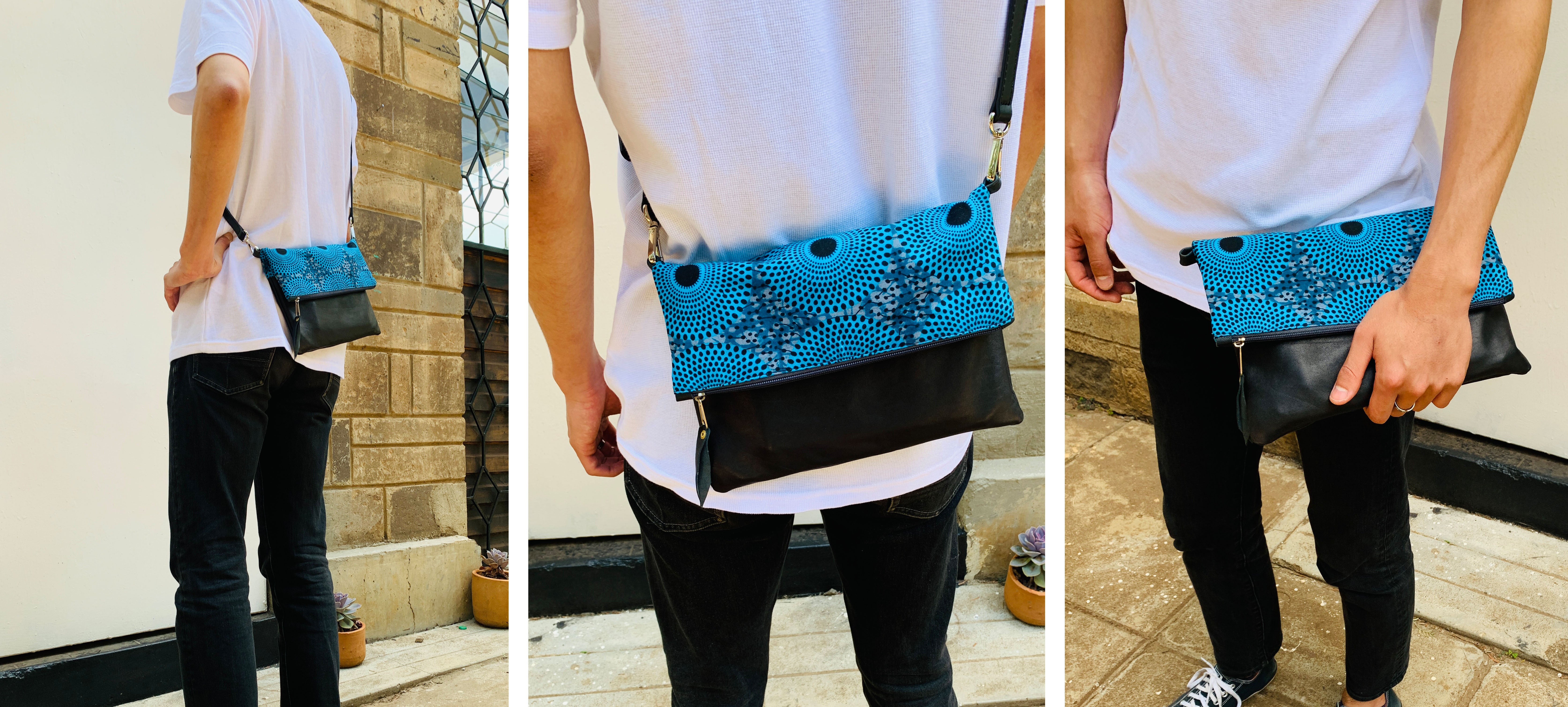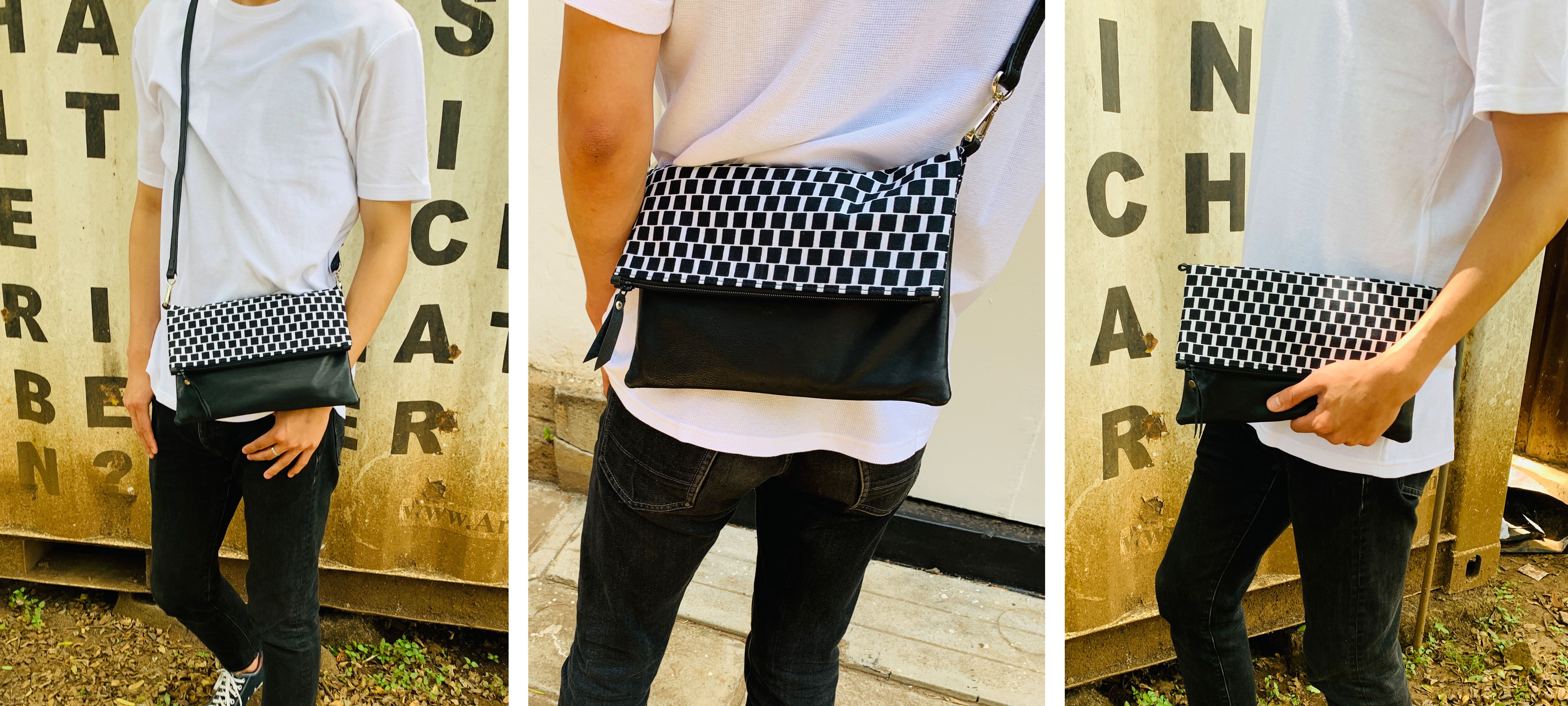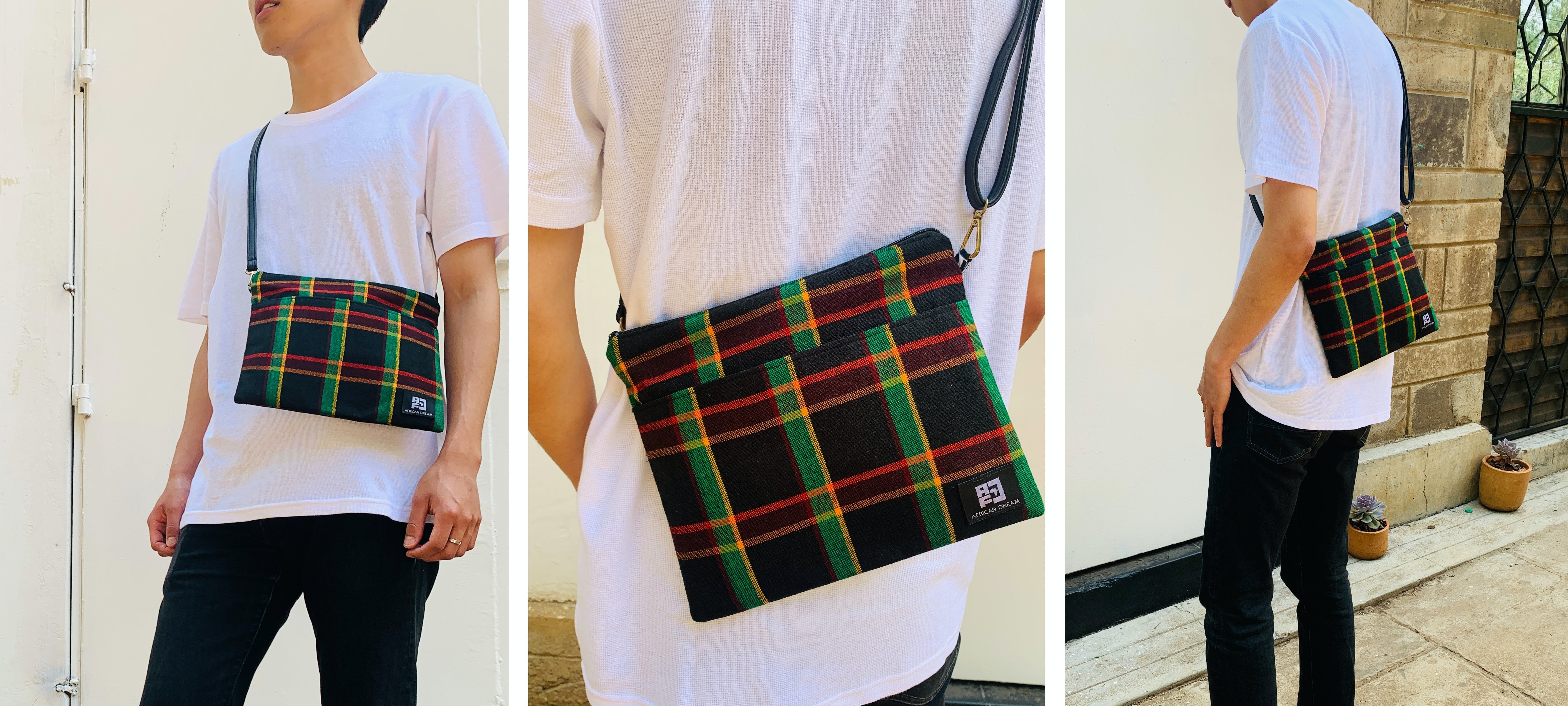 アフリカのカラフルで個性的な布や、古着の再利用レザーを使ったサコッシュでファッションを楽しみながら、商品の購入が現地の雇用創出・環境問題への取組みに繋がる、そんなプロジェクトです。