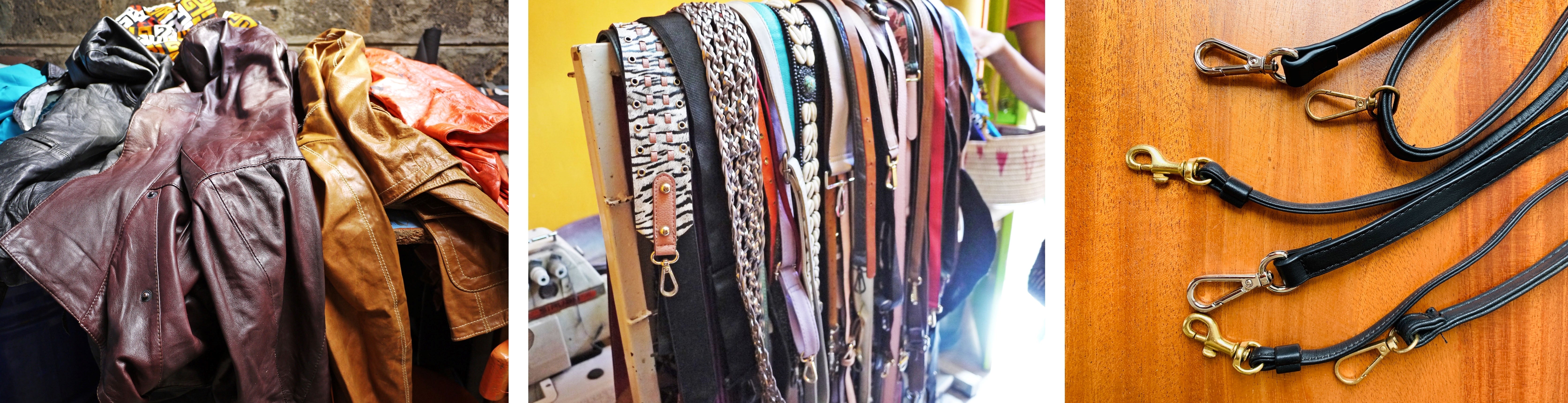 バッグに使われるレザーは先進国から入ってくる古着のレザージャケットを解体したものや、他のテーラーが捨てる予定の端切れを再利用しています。