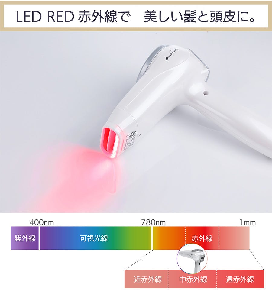 ピュアリズムゼロは頭皮と毛髪の乾燥はもちろんコラーゲン生成、炎症の治療に優れた650nmから850nmの赤外線を搭載。光の波長を利用し頭皮ケアを行います。