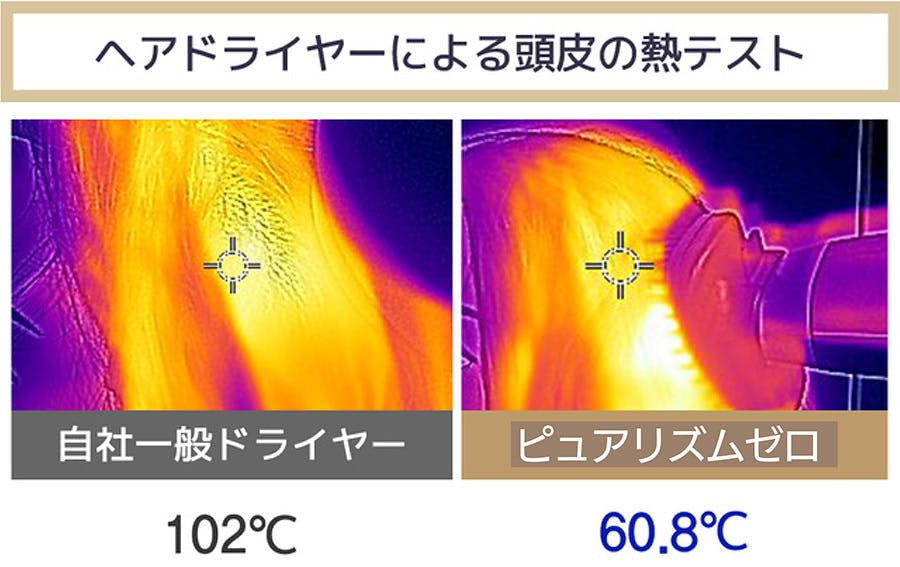 セラミックヒーターが内蔵されているピュアリズムゼロのヘアドライヤーは、正確な温度調節が可能で、頭皮に刺激が少ない低温乾燥が可能です。