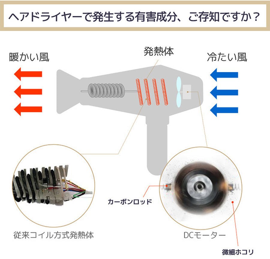 ヘアドライヤーで使用される内部コイルは、熱の温度が高く、内装材や仕上げ材に熱が伝導し、ドライヤー本体の耐久性を落として有害物質を発生させることがあります。