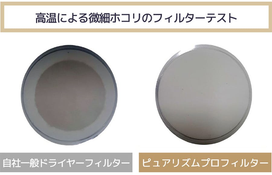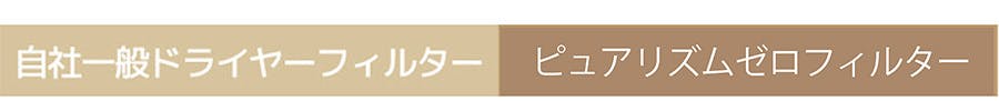 ピュアリズムゼロは健康な髪を保つドライヤーの開発のため、ヘアドライヤー動作時の風に発生する成分を測定できるチャンバーを作り、テストを行いました。自社一般のドライヤーの場合、有害物質(重金属/銅)が発生し、フィルターに黄褐色の有害物質が捕集されますがピュアリズムゼロ場合、フィルターはテスト前とほぼ同じ。有害物質が発生しないことが分かります。