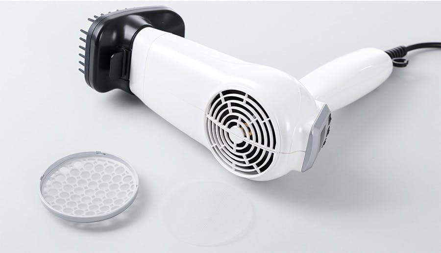 ②ホコリや髪の毛などがドライヤーの中に入り込んでしまうと発火の危険性がありますが、ピュアリズムゼロは空気清浄機でも使用されているプレフィルターを装着し、異物とほこりを濾過し、ドライヤーの中に入り込むことを防止します。