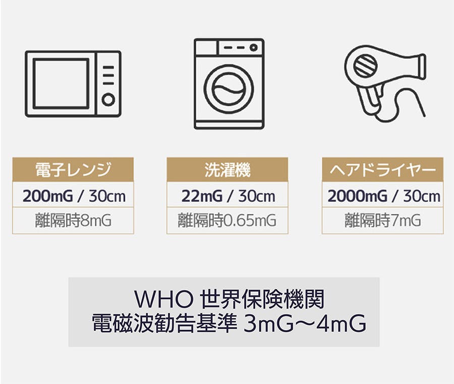 コイル方式の一般ヘアドライヤーの電磁波放射量を測定した結果、実際に電子レンジで放出される電磁波の量と大きな差がないことを確認することができました。(*自社にて実施したテスト結果です。)