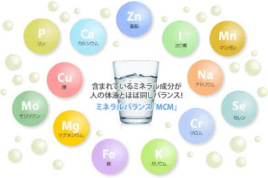 特許取得(特許番号第3247620号)の天然ミネラルサプリメントMCM(Marina Crystal Minerals)を、専用工場でRO水(1000分の1mmのフィルターでろ過した不純物の無いクリーンなお水)にブレンドしました。