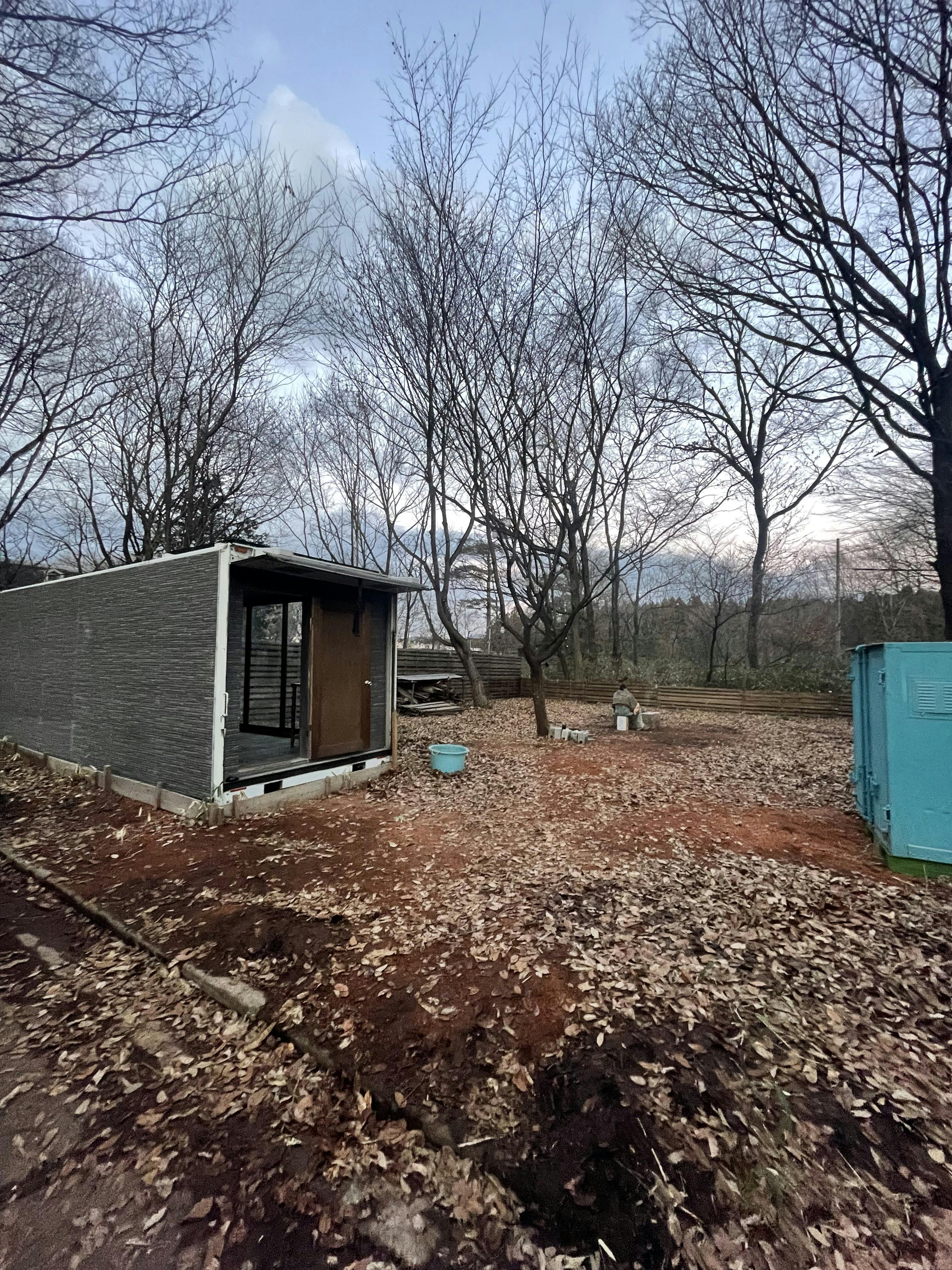 整地 ユンボ導入 仮設管理棟(単管による櫓と竹デッキ) 簡易水栓