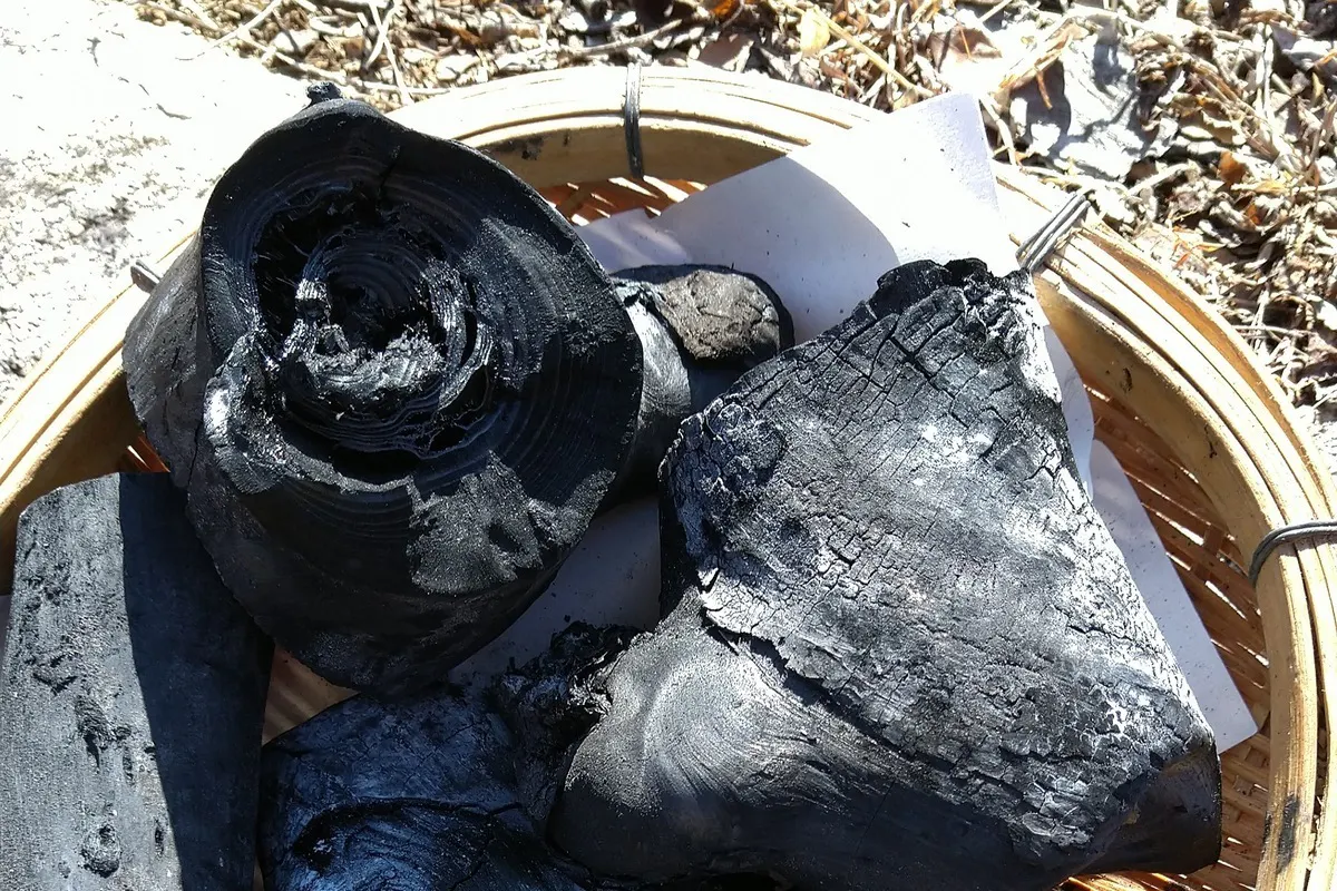 今回、御神縁を賜り390年の天寿を全うされた石神の松を炭に焼かせていただきました。準備から窯への運搬、火入れご神事から焼き上がりまでの約8か月間、松と語り、松と遊び、松と息を合わせて共に舞う、至高至福の時間でありました。