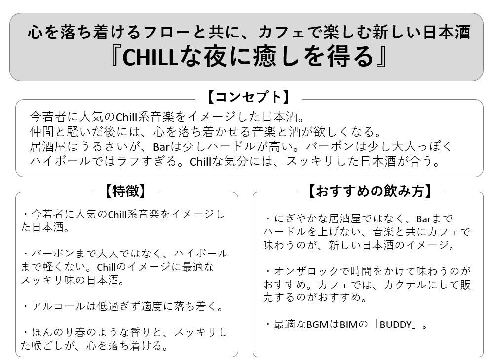 今回の商品のネーミング「CHILLな夜に癒しを得る」を、なんか長い名前だなと思った方は多いのではないかと思います。