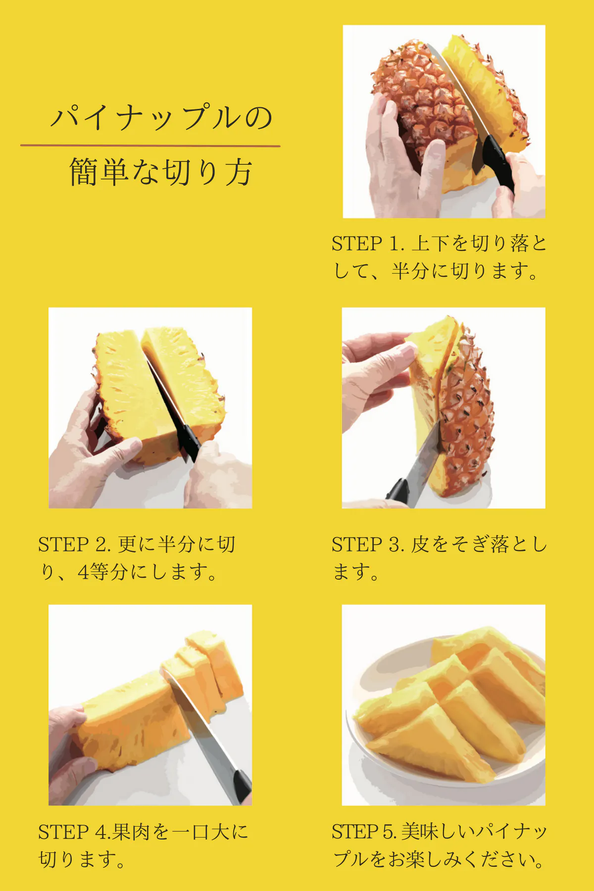 硬い皮の印象がありますが、完熟出荷するパイナップルは意外なほど柔らか。ご家庭で簡単に美味しく盛り付けていただけます。