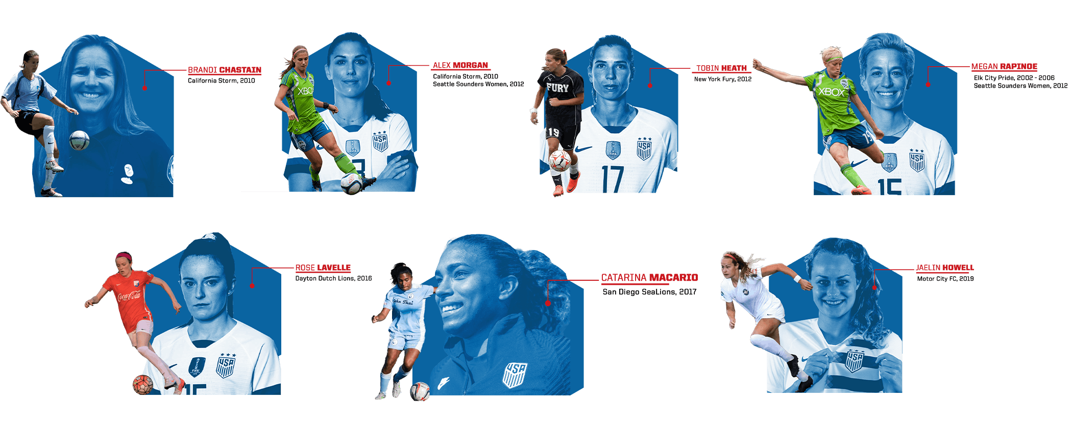 WPSLを経てプロの道へキャリアを伸ばしてき た選手は累計1000人を超え、下記のアメリカ代表主力選手以外にも、ワールドカップやオリン ピックへの出場経験のある選手や、現在米国1 部NWSLで活躍する選手、海外のプロリーグへ 挑戦している選手も数多く存在します。