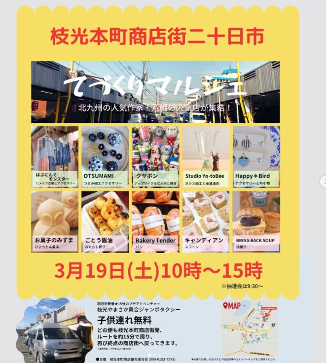 枝光本町商店街のご紹介①テーマはつながり。地域住民との貴重なつながりの機会をして企画しているのが、毎月10日(十日市)と毎月20日の(二十日市)です。商店街一体で、お買い得な商品や、マルシェ等の企画をしています。福岡県ではまん延防止が解除となっており、徐々に活動を再開しています。まだまだ様子をみつつ、感染対策にも気を使いながらですが、日常が戻るのではという少ない希望をもちつつ頑張っています。今回は二十日市を1日前倒しての3月19日に開催します。お寄り可能な方は是非、お越しください。