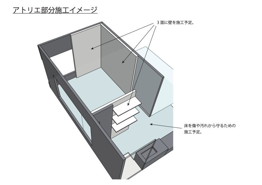 そのため、施工イメージにあるように壁を建てることで作品の撮影や、絵をかけて作業できるように改装をしています。