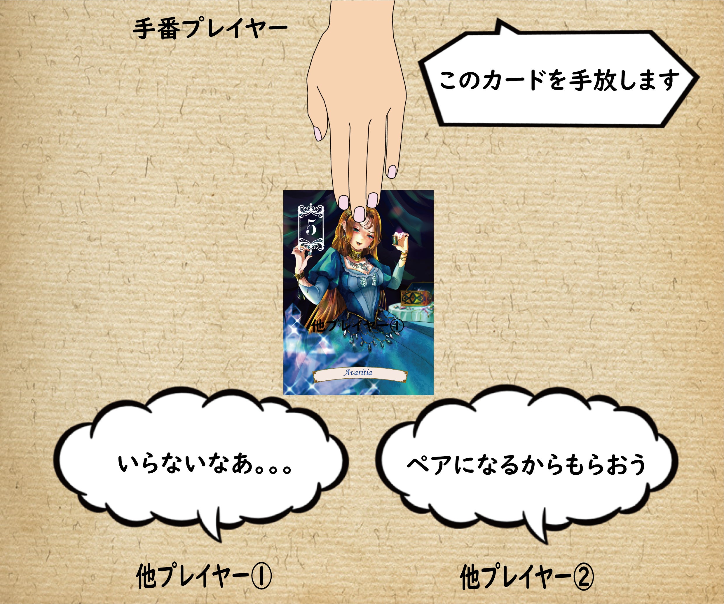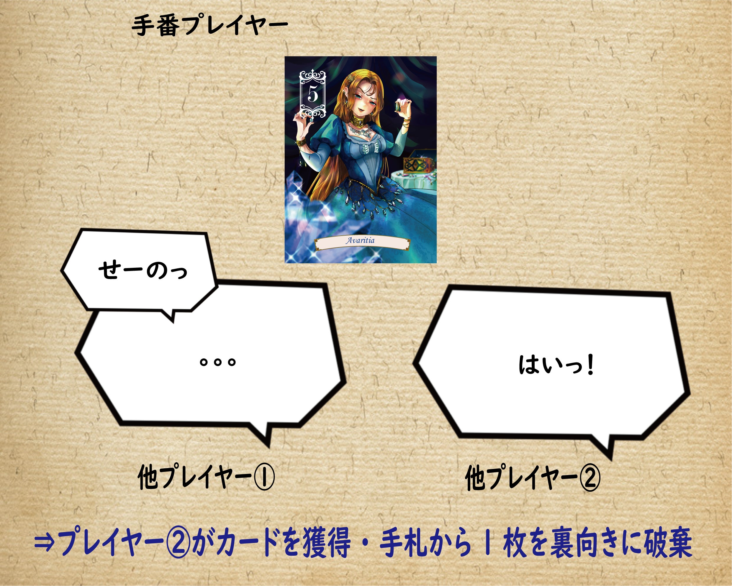 手放されたカードはその希望者にわたり、希望者は代わりに手札を1枚、裏向きに破棄することができます。(何を捨てたかわからないように捨てれるこのムーブは強力です。)