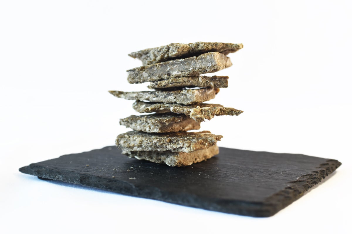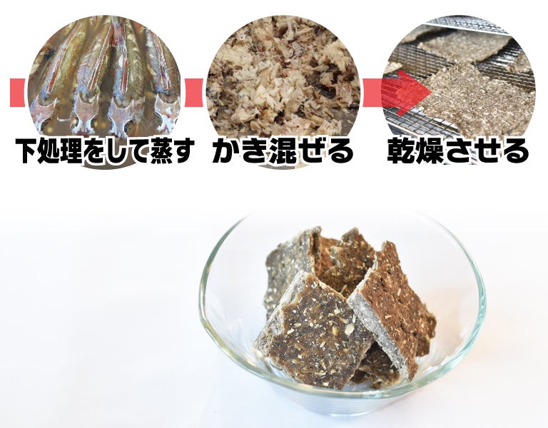 小さなお子さまや、高齢の方にも安心してお召し上がりいただくための技術でしたが、この技術を応用して魚を骨まで柔らかくして味をつけずに撹拌、均一に乾燥することでわんこのためのお魚100%の安全なご飯が作れると考えました!