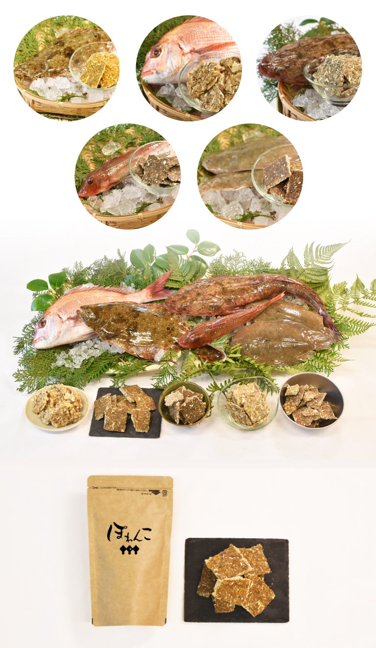 未利用魚として市場で比較的多くみかけるタイ、ヒラメ、コチ、ホウボウ、ガンゾウビラメの5種の試作を繰り返し、ようやく添加物無添加、つなぎすらも利用しない正真正銘原材料はお魚100%のぽわんこは製品化の品質を備えたクオリティが実現しました。