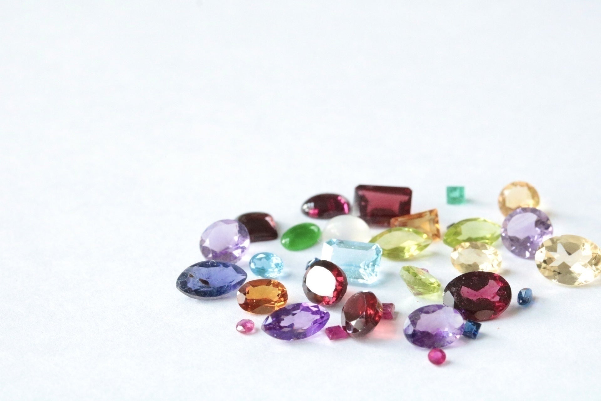エメラルド・ルビー・サファイア・アイオライト・アクアマリン・ブルートパーズ・ホワイトトパーズ・トルマリン・ガーネット・アメジスト・シトリン・ペリドット・オパール・クオーツ・翡翠(ヒスイ)など