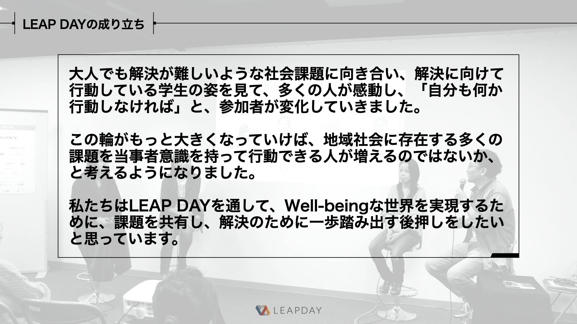 LEAP DAYは、高校生や大学生たちがプレゼンテーションという形で挑戦できる場にもなっています。より多くの人に、自分自身の考えやアクションしてきたことを発表することで、社会を変えるチャンスの場にもなります。