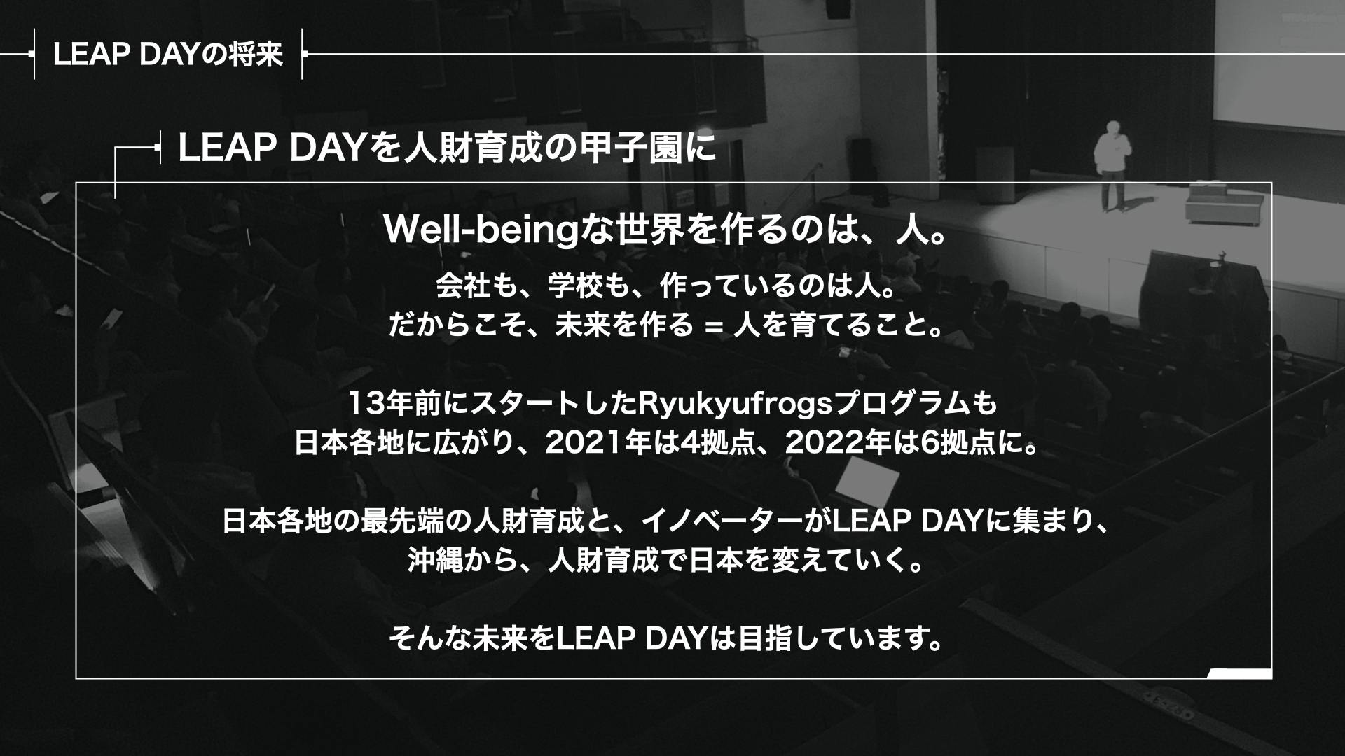 元々、沖縄発の人財育成の取り組み「琉球frogs」という取り組みの成果発表の場として開催していたのがLEAP DAYでした。