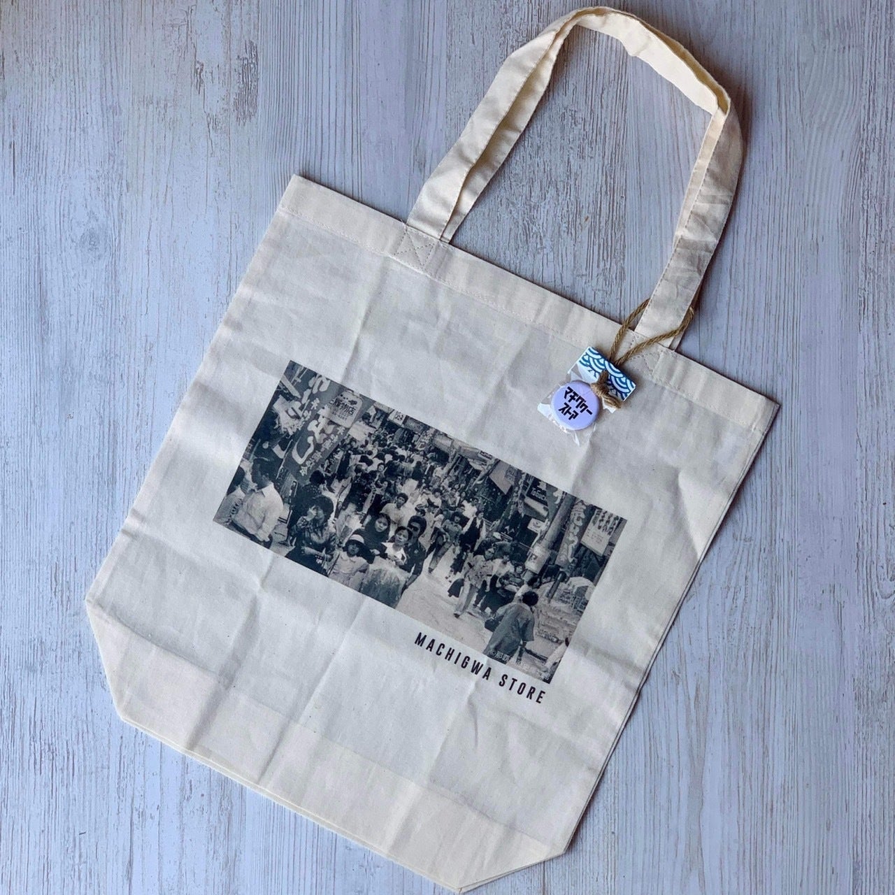 昔の那覇マチグヮーの写真がプリントされたエコバッグと、マチグヮー応援缶バッジのセットです。