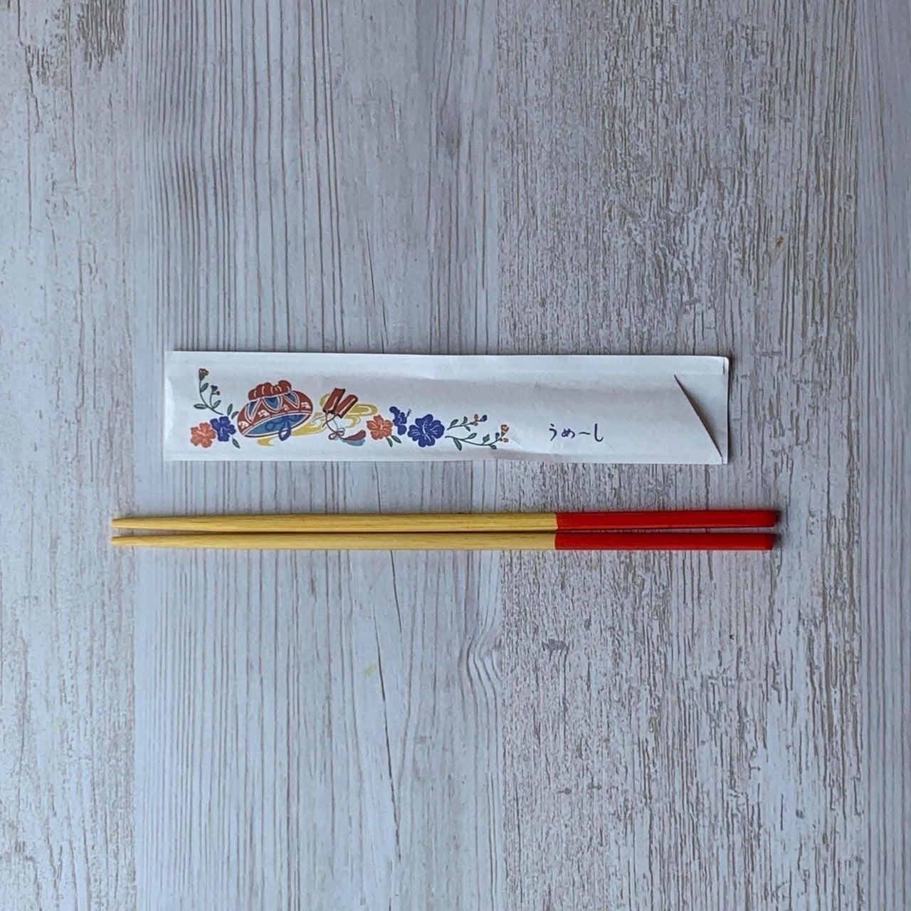 沖縄では、お箸のことを方言で「うめーし」といいます。沖縄県民なら誰もが街の食堂で見かけたことがあるはず。赤色の部分は太陽、黄色の部分は月を表しているとも言われています。