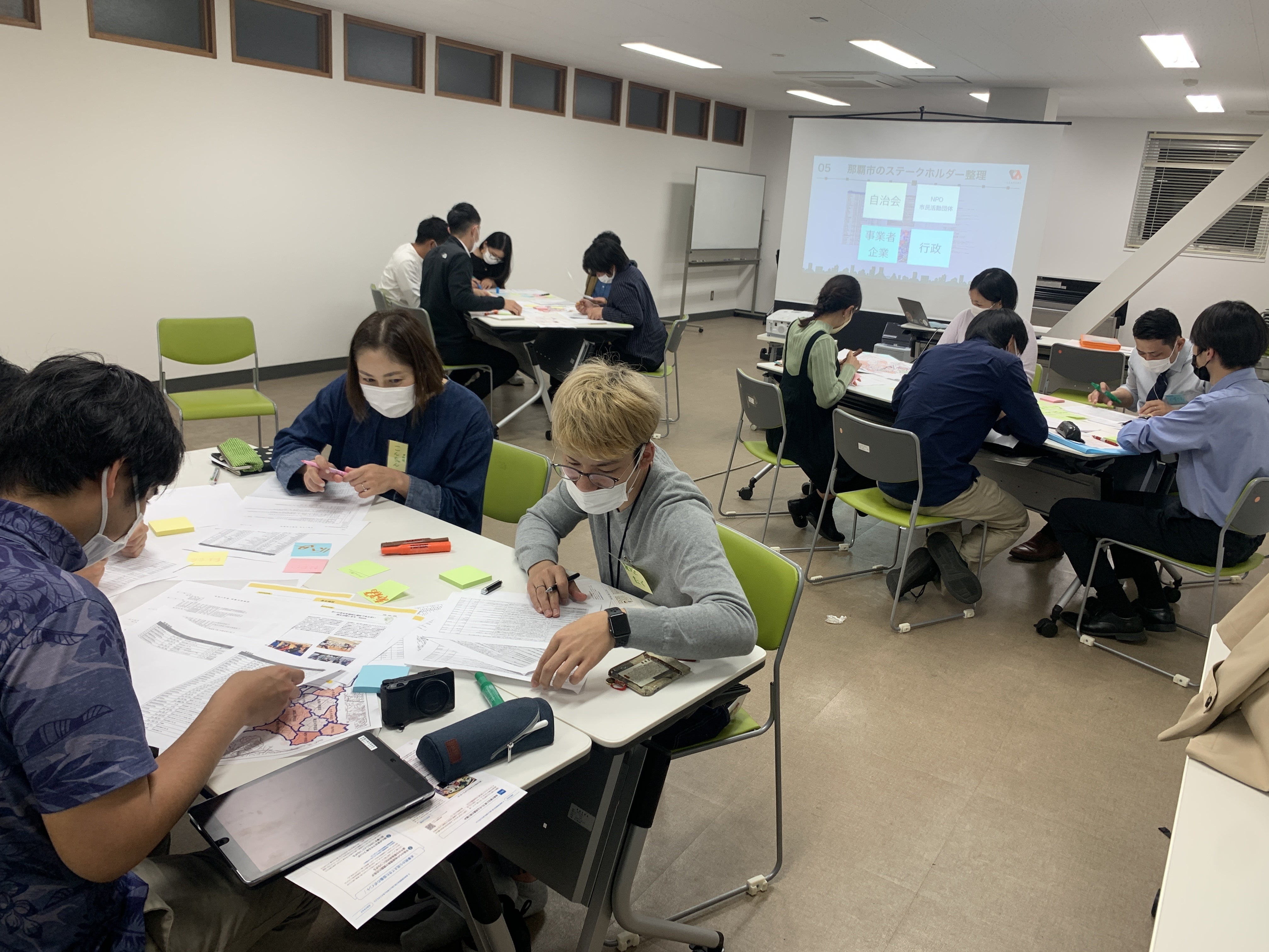 自治会リストや那覇市行政組織図、NPO法人リスト、小学校区まちづくり協議会のマップなどを見ながら、解決のためにどんなステークホルダー(=協働のパートナー)と協力できるかを整理しながら、「私」はどんな関わり方ができるかを考えました。