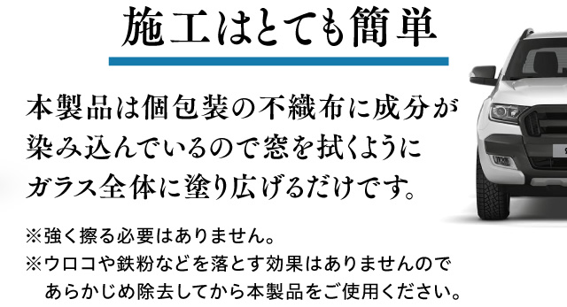 ※パッケージは2セット入っていますので、フロントガラスの右側と左側の半分つづを2回に分けて手順1~3を繰り返し、塗付剤が乾く程度まで塗り広げて下さい。