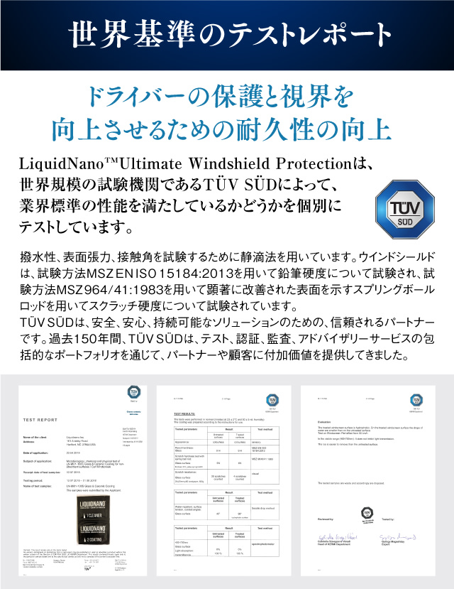 LiquidNano施工後のフロントガラス表面はナノスケールガラス粒子がこれらの表面の欠陥を満たし滑らかな表面にすることで、水をはじき、UVを反射、視界を向上し、フロントガラス表面の硬さを強化します。
