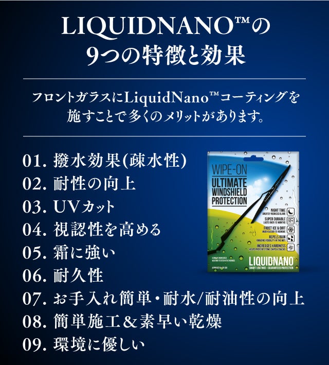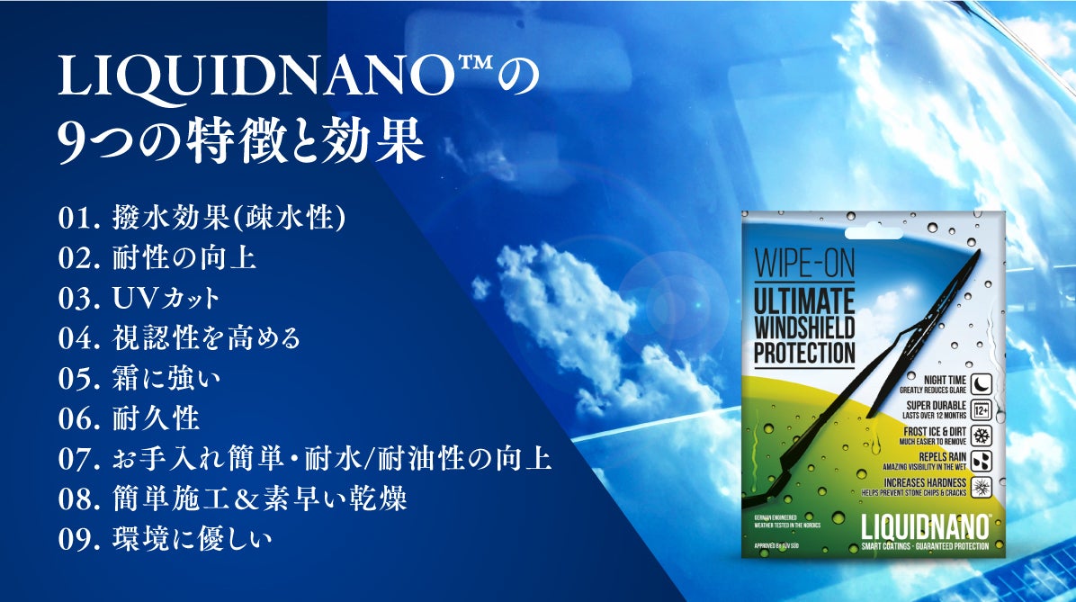 寒冷な冬は、LiquidNano™は、フロントガラスの耐寒性を高め、ガラスの凍結を防止し、積雪を防ぎます。