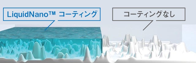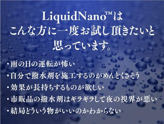 LiquidNanoはガラスの元成分である二酸化ケイ素が髪の毛1本より細かいNanoレベルの細かさで肉眼では見えない表面の凹凸に浸透し、完全な平面を作り出し1年に1回の塗付だけで長期間の効果を発揮・持続します。
