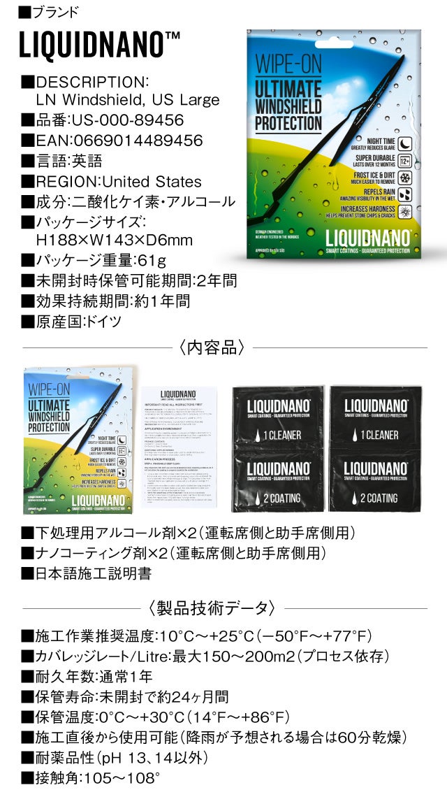 雨をはじき、衝撃・欠け・小さな亀裂や表面の引っかき傷、雨・氷・霜に対するフロントガラスの耐性を高めます。
