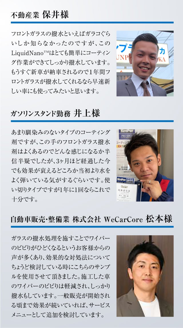 今回の製品は安全運転と車をきれいに保つという両側面から簡単施工で耐久性の高い新しいタイプのガラスコーティング剤に共感して頂けると幸いです。