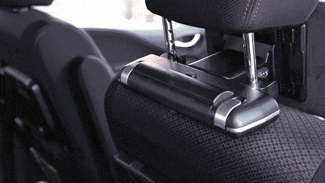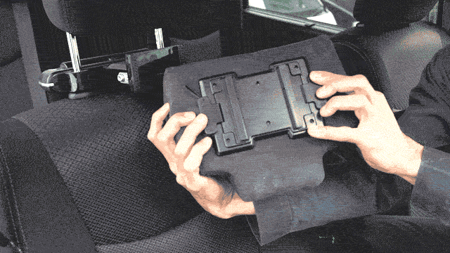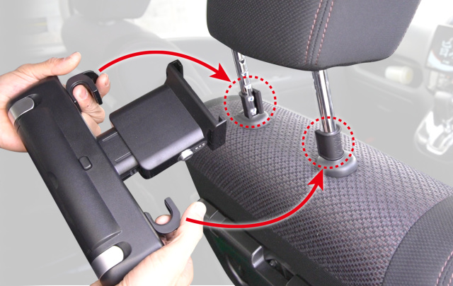 瞬時に誰でも簡単に設置が可能です。純正ヘッドレストの金属棒に車種ごとの太さに合わせてアタッチメントをつけて内蔵されたバネの力で引っ掛けるだけ