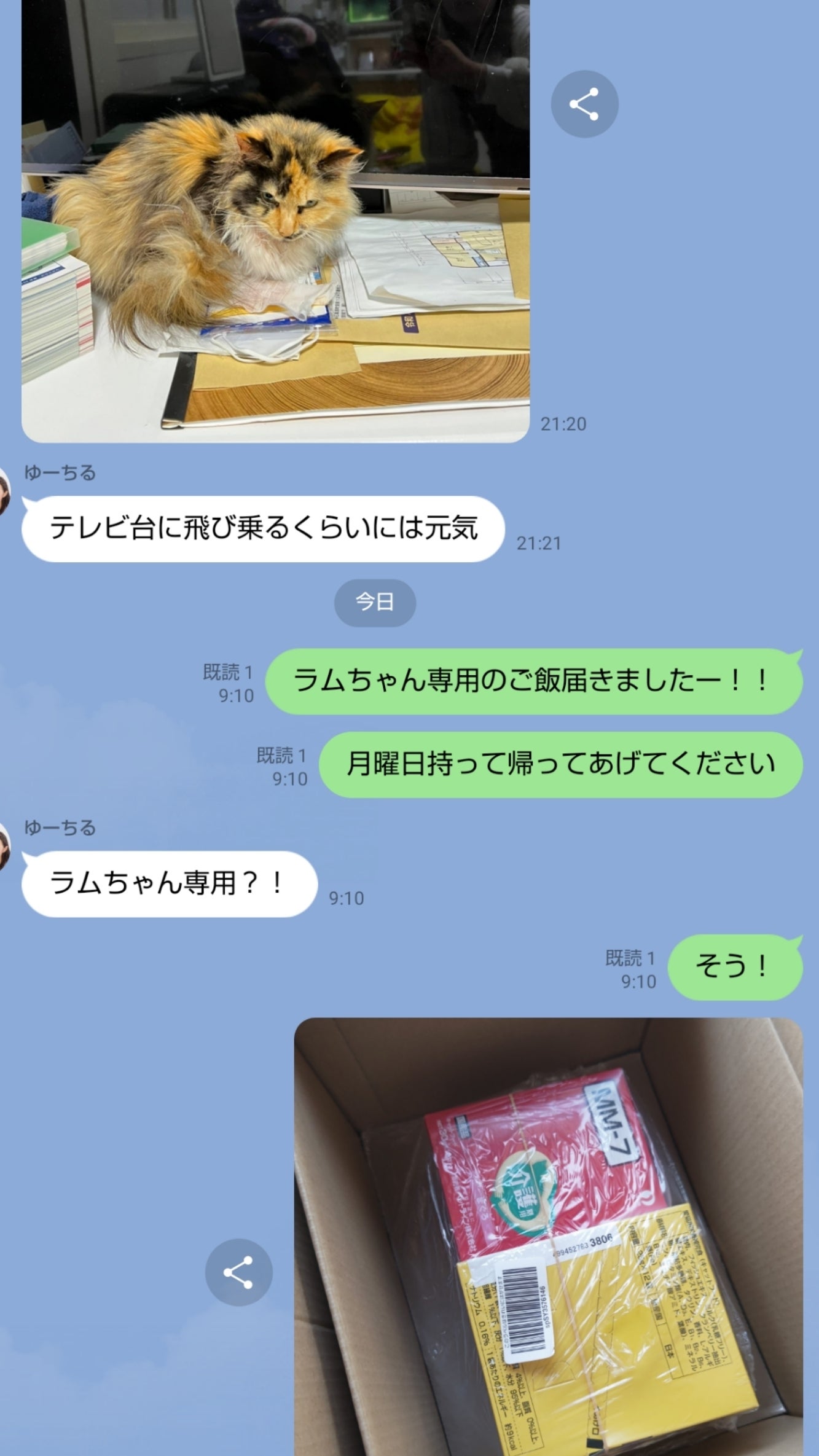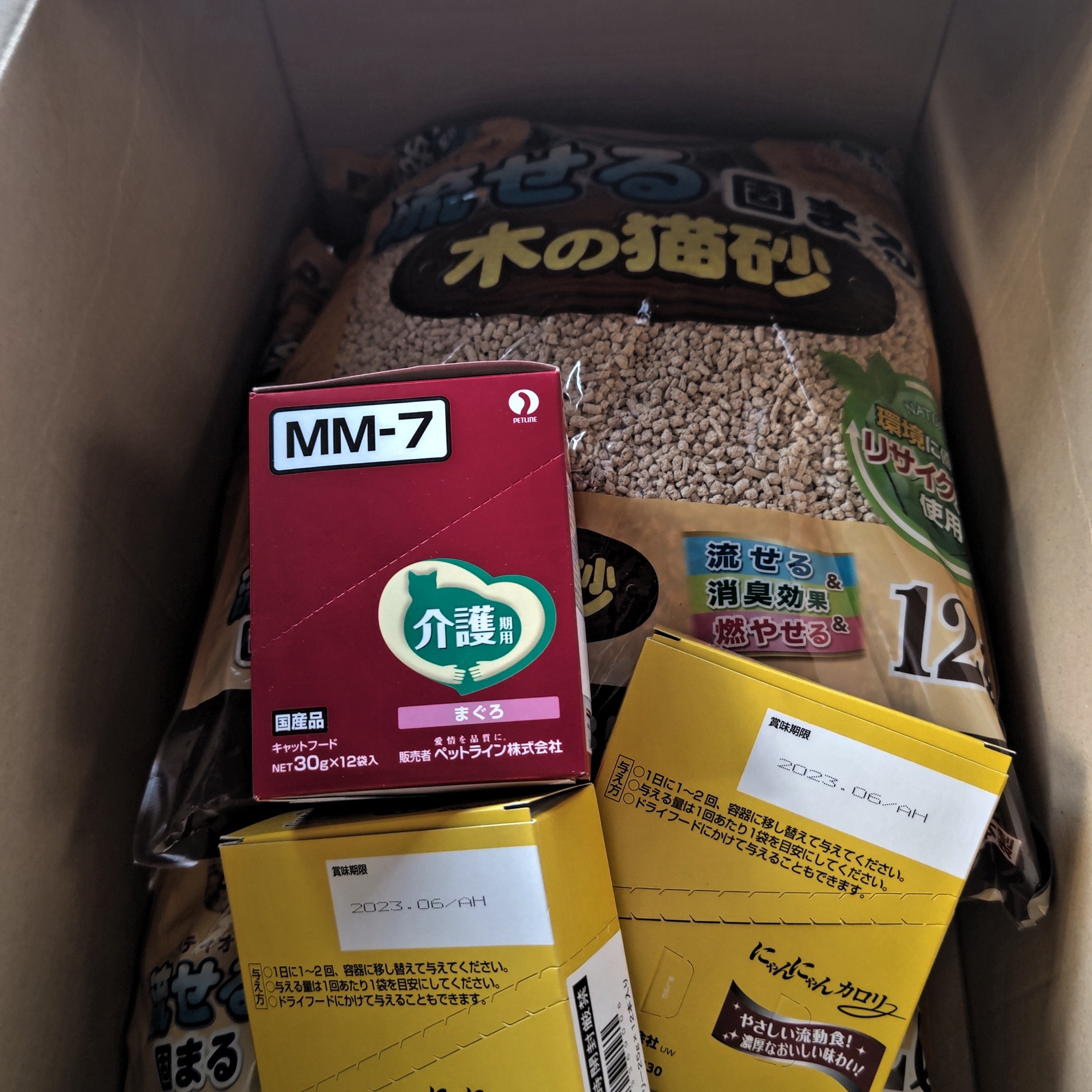昨日、Amazonから荷物が届きました。欲しい物リストから猫砂、ラムちゃん用の介護食を支援して頂けました!!!ありがとうございます!ラムちゃん用に購入して飲んでくれなかった猫用ミルクは、猫ハウスにいる保護猫達にあげることにしました。カリカリにふりかけたら食べる食べる…w