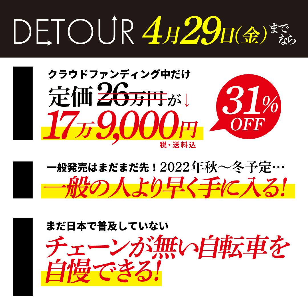 ✓クラウドファンディング期間が終わると、DETOURの価格は、『定価260,000円』となります。